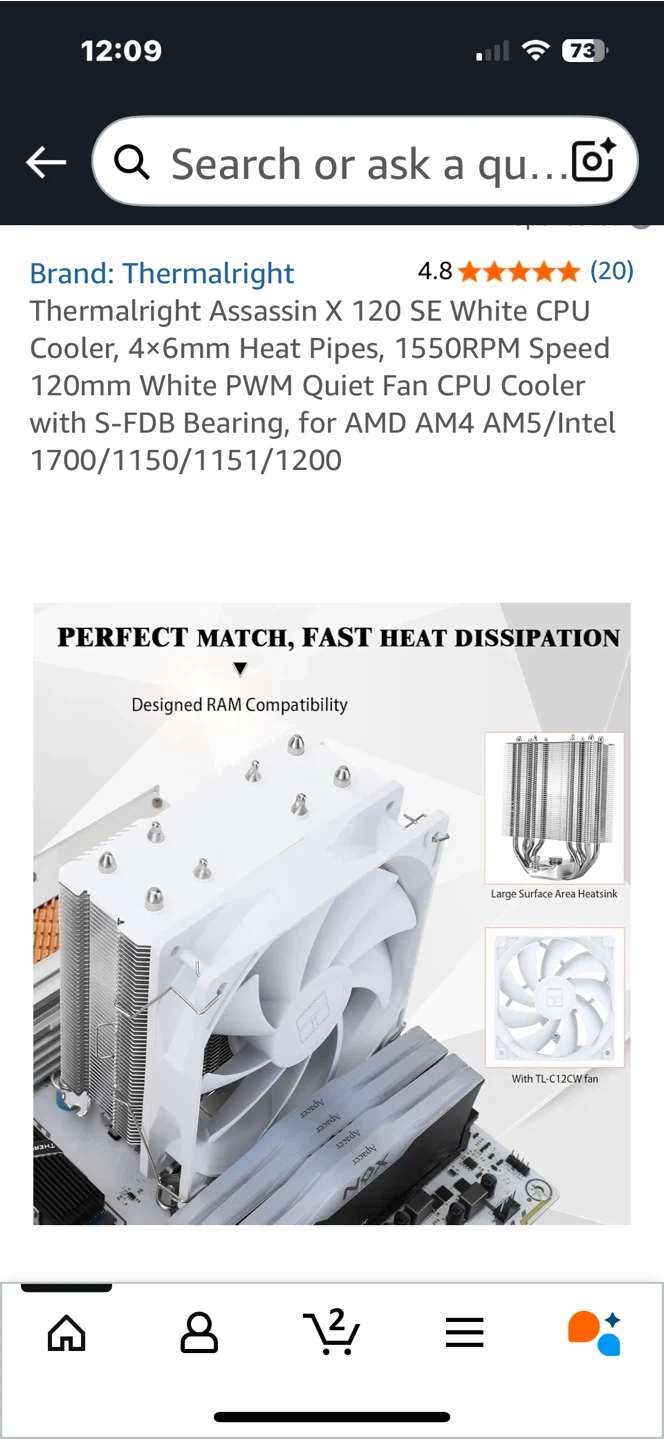 Selling a Thermalright Assassin X 120 SE White CPU Cooler. It features 4x6mm heat pipes and a 120mm white PWM quiet fan. Designed with S-FDB Bearing, compatible with AMD AM4 AM5/Intel 1700/1150/1151/1200 sockets. It's a powerful fan with AGHP GEN 3 technology for anti-gravity performance and fast heat dissipation! Perfect match for designed RAM compatibility