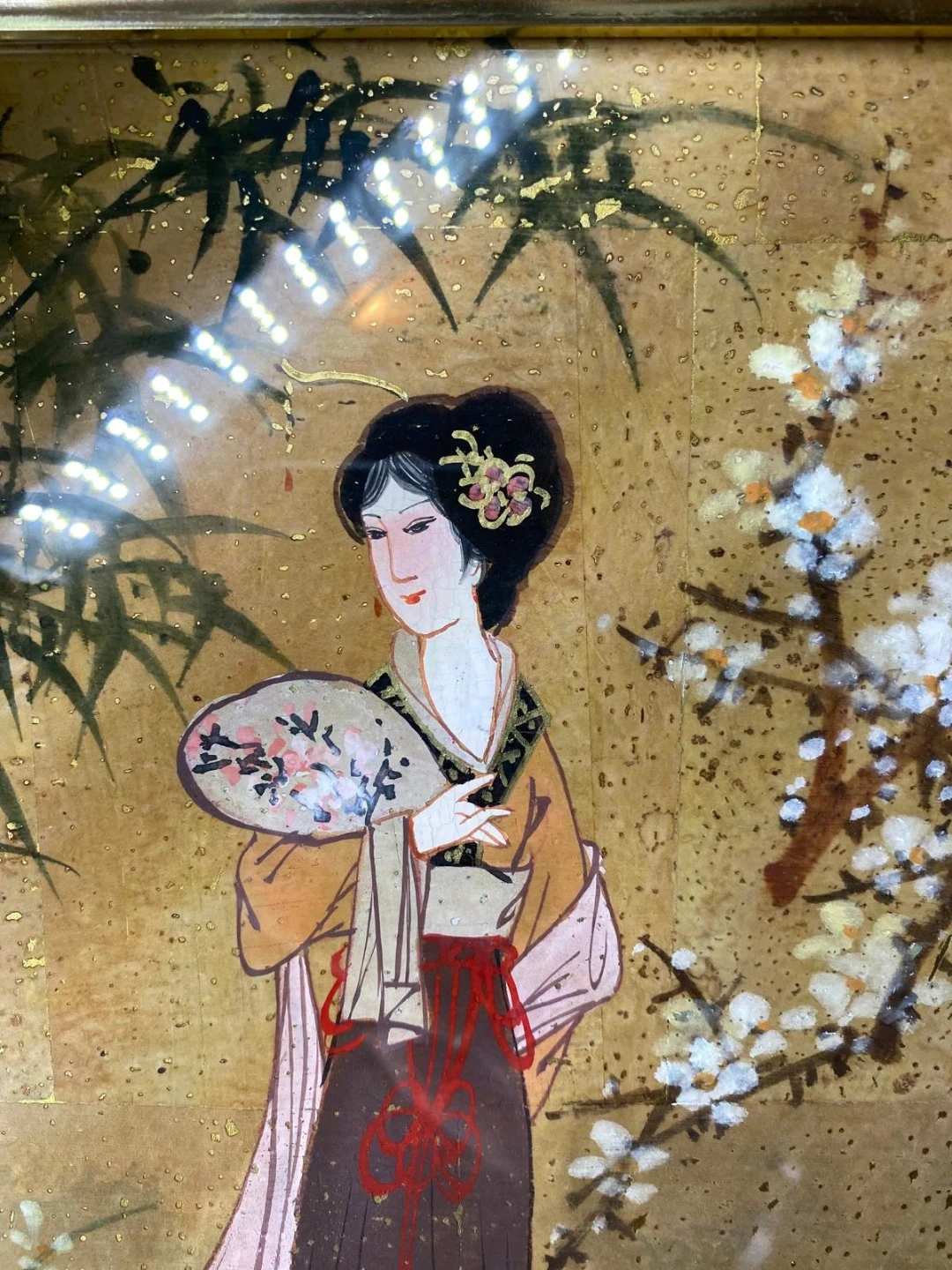 Selling a framed painting piece of Asian art. It depicts a woman with a fan in a garden setting. The frame is gold-colored and has a bamboo-like design.