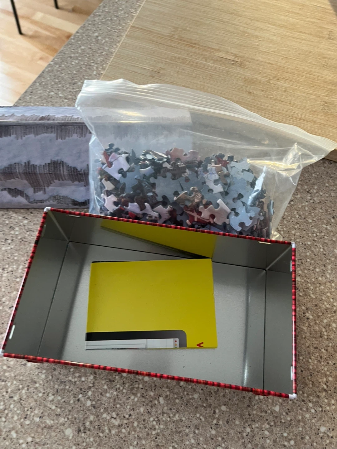 550-piece jigsaw puzzle featuring a charming barn in winter scene. The puzzle is in great condition and comes with all the pieces. It's perfect for a cozy night in or a fun activity with the family!