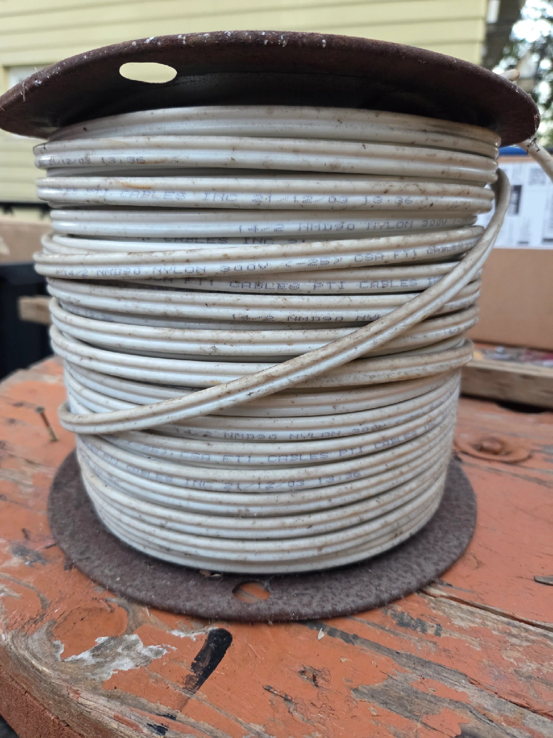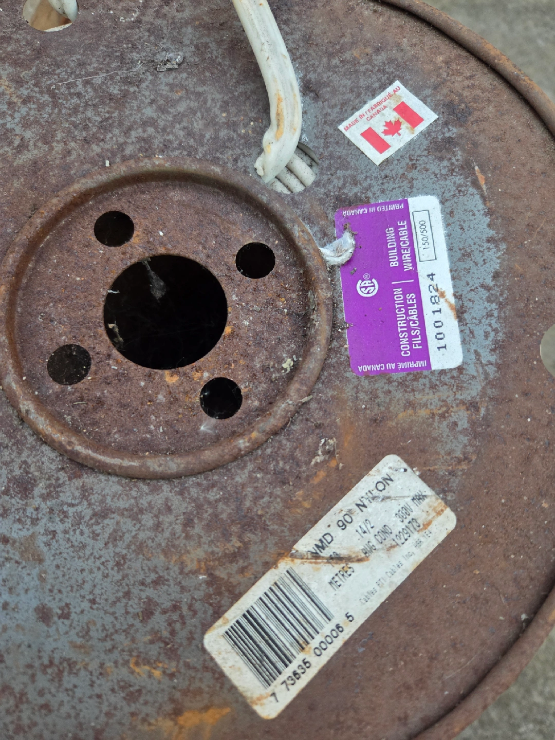 65Selling a roll of 75m(246') 14/2 NMD90 NYLON building wire/cable. It's marked with a CSA CONSTRUCTION PILS/CABLES label. This copper cable is perfect for various electrical projects. We have found this reel in our garage, after cleaning it out. It is a bit dusty from storage but has been kept dry.