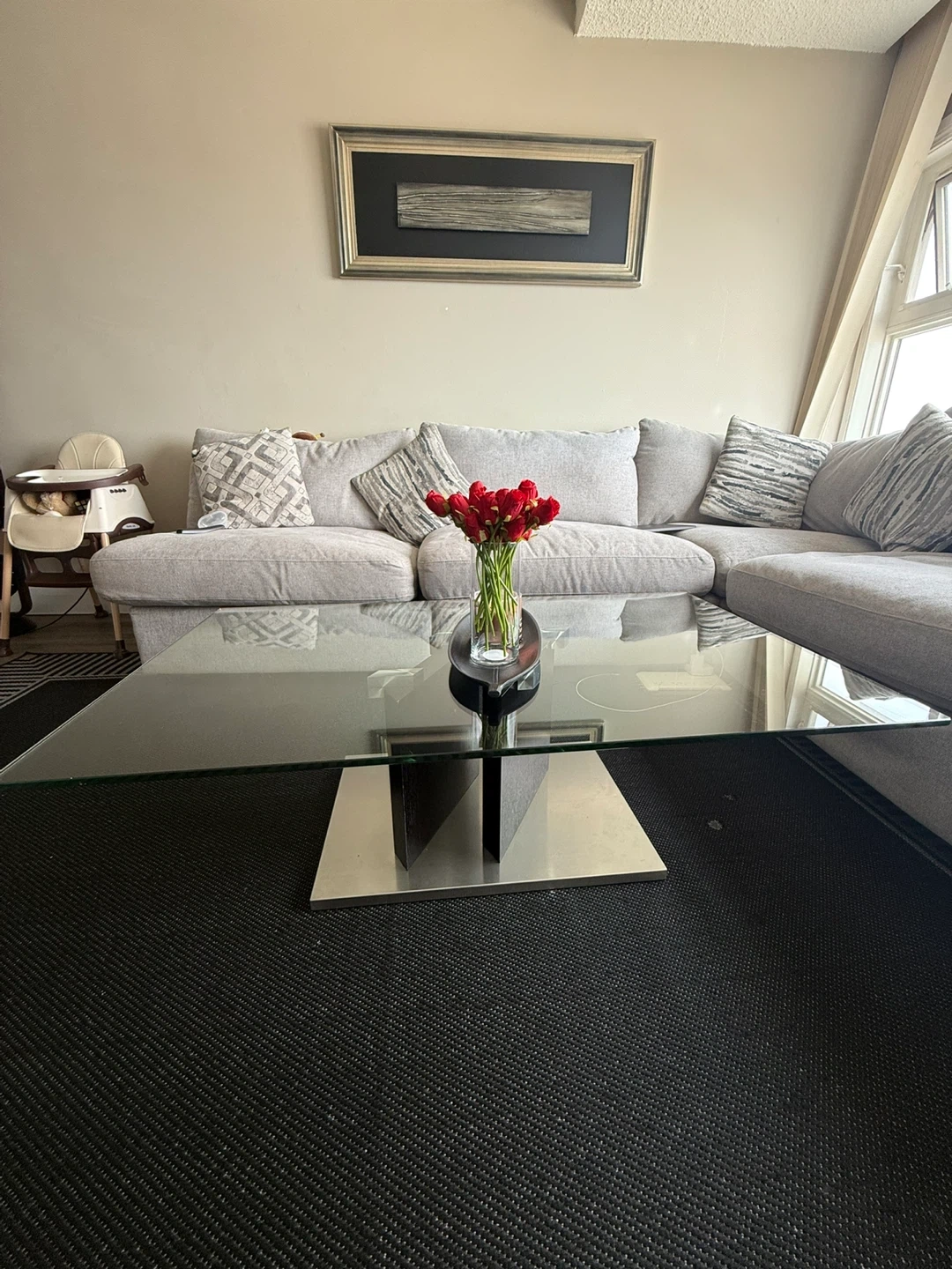 Modern coffee table featuring a clear glass top and a sleek metal base. Its minimalist design complements various living room styles. Provides ample surface space for everyday use.