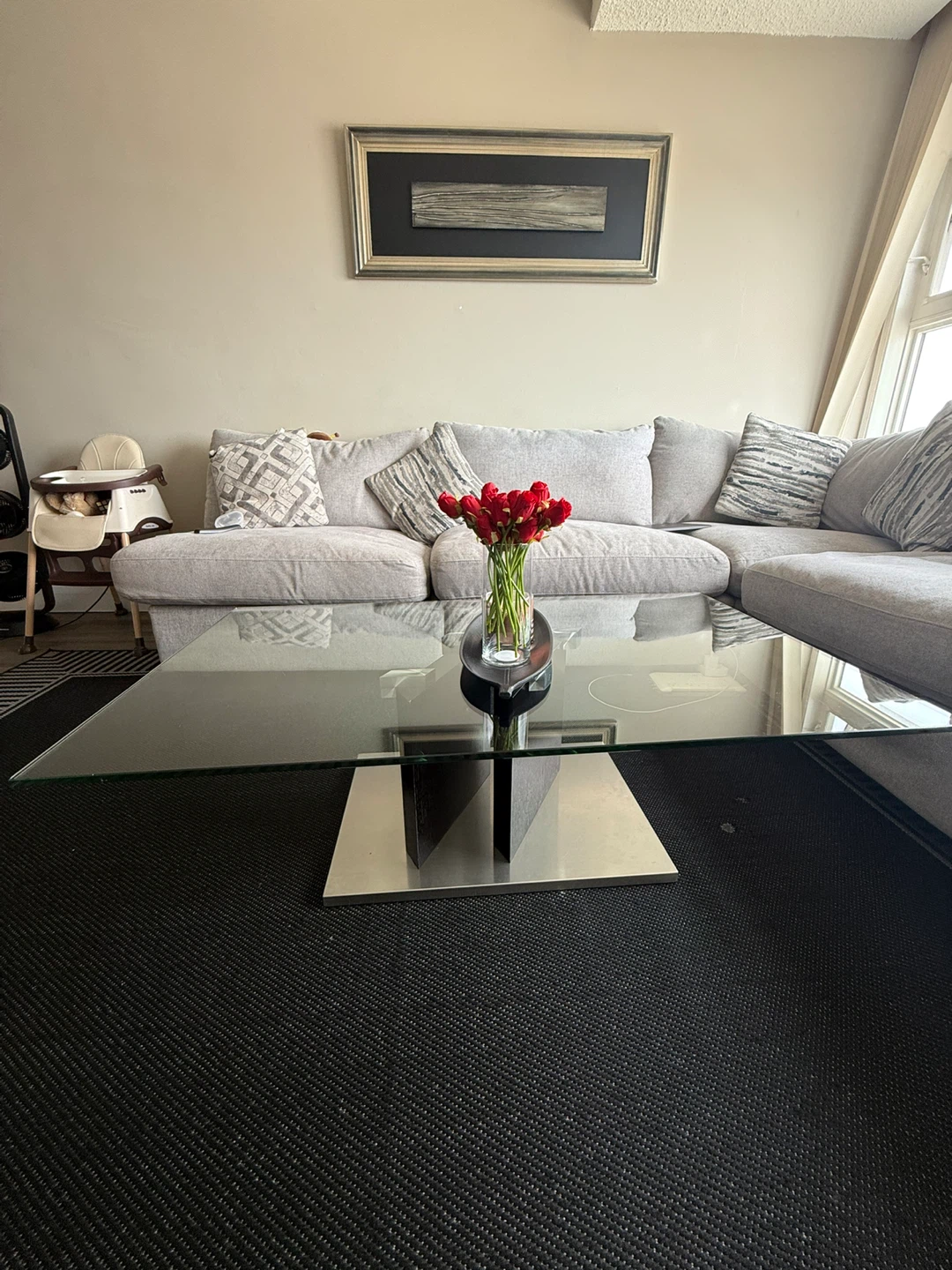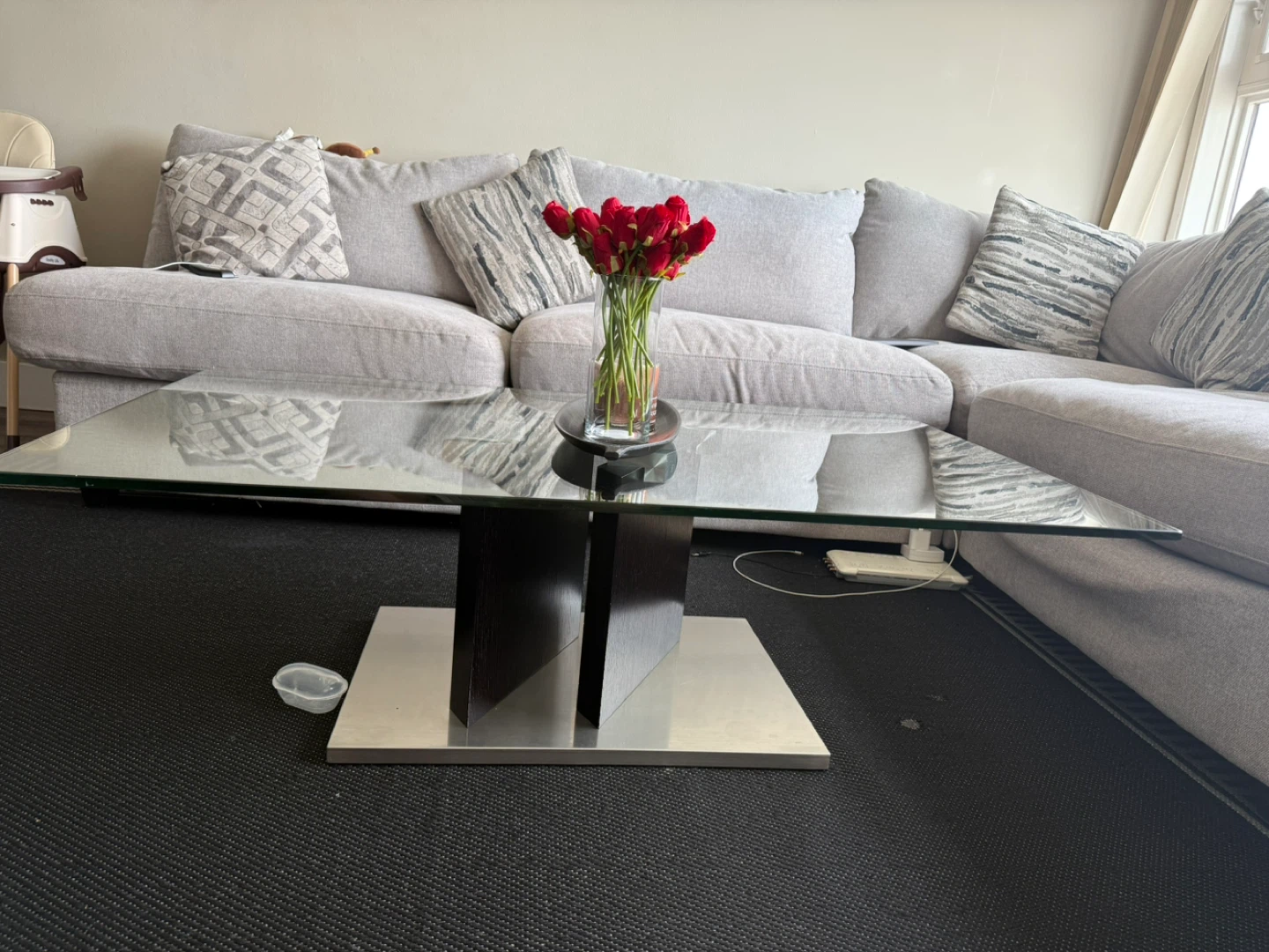 Modern coffee table featuring a clear glass top and a sleek metal base. Its minimalist design complements various living room styles. Provides ample surface space for everyday use.