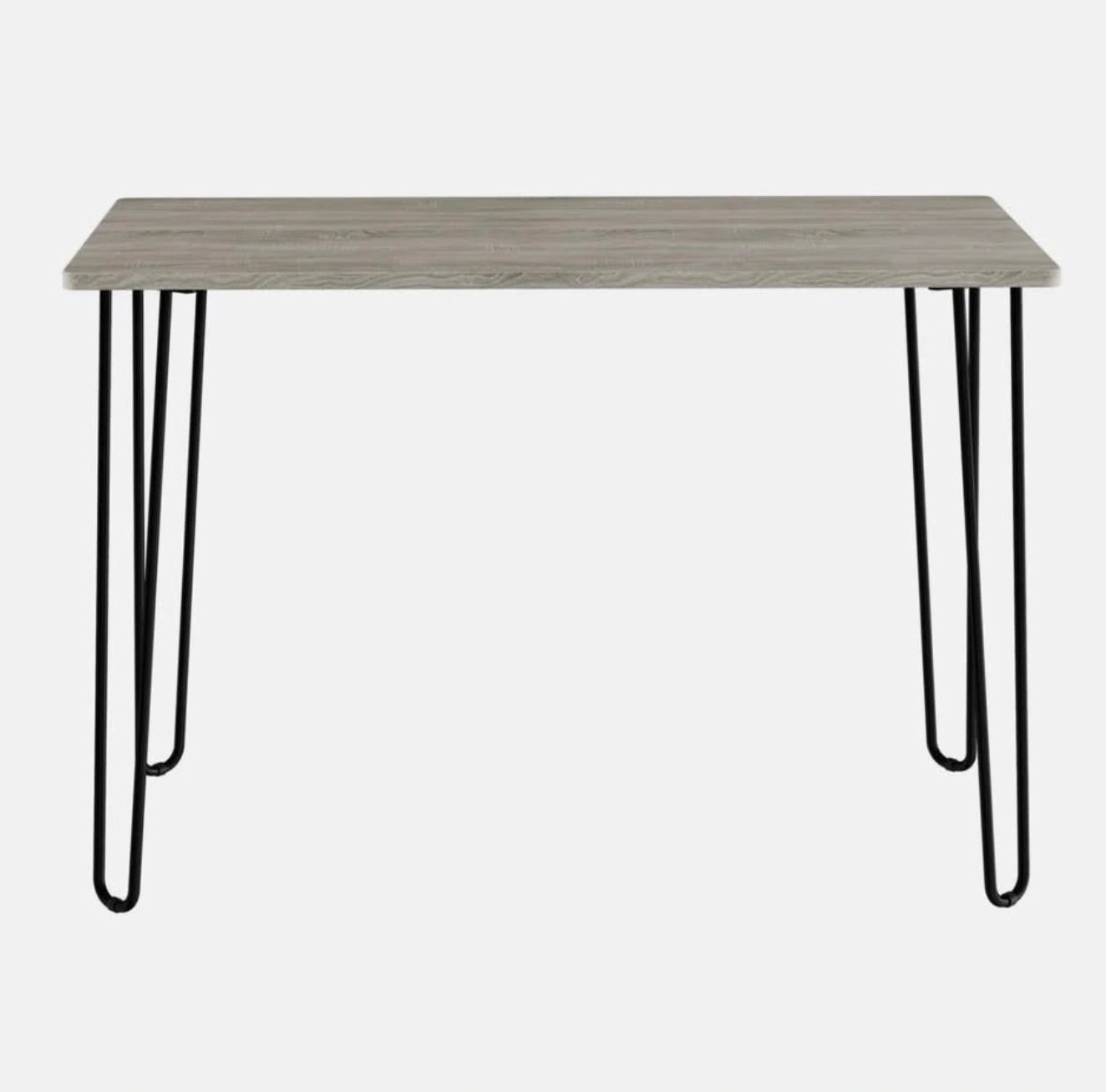 Stylish modern industrial desk with a woodgrain-look top and black steel hairpin legs. Its compact size is perfect for small apartments, home offices, bedrooms, or study spaces.