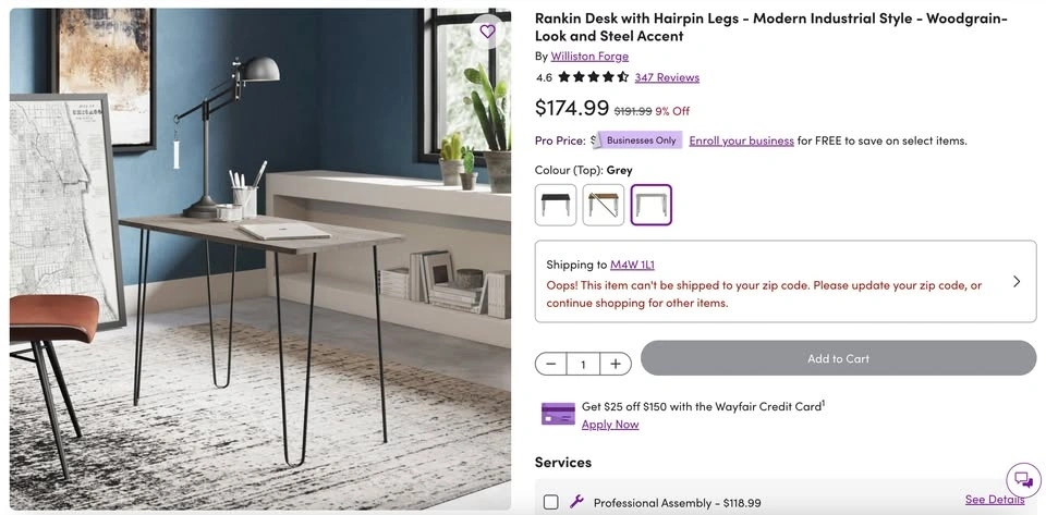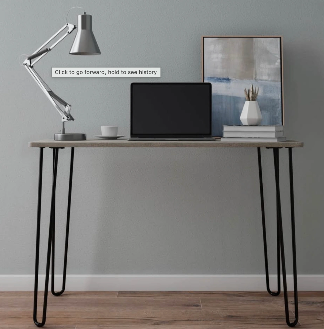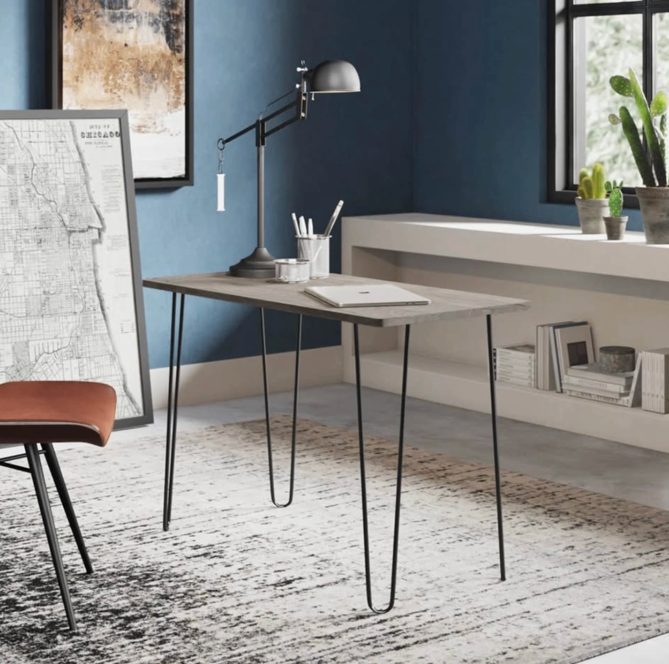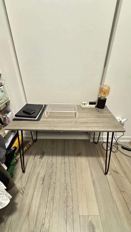 Stylish modern industrial desk with a woodgrain-look top and black steel hairpin legs. Its compact size is perfect for small apartments, home offices, bedrooms, or study spaces.