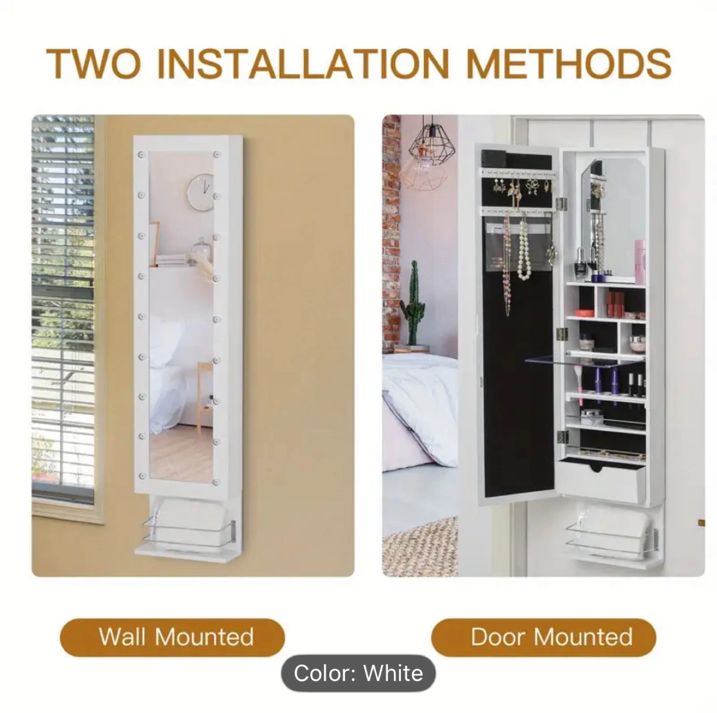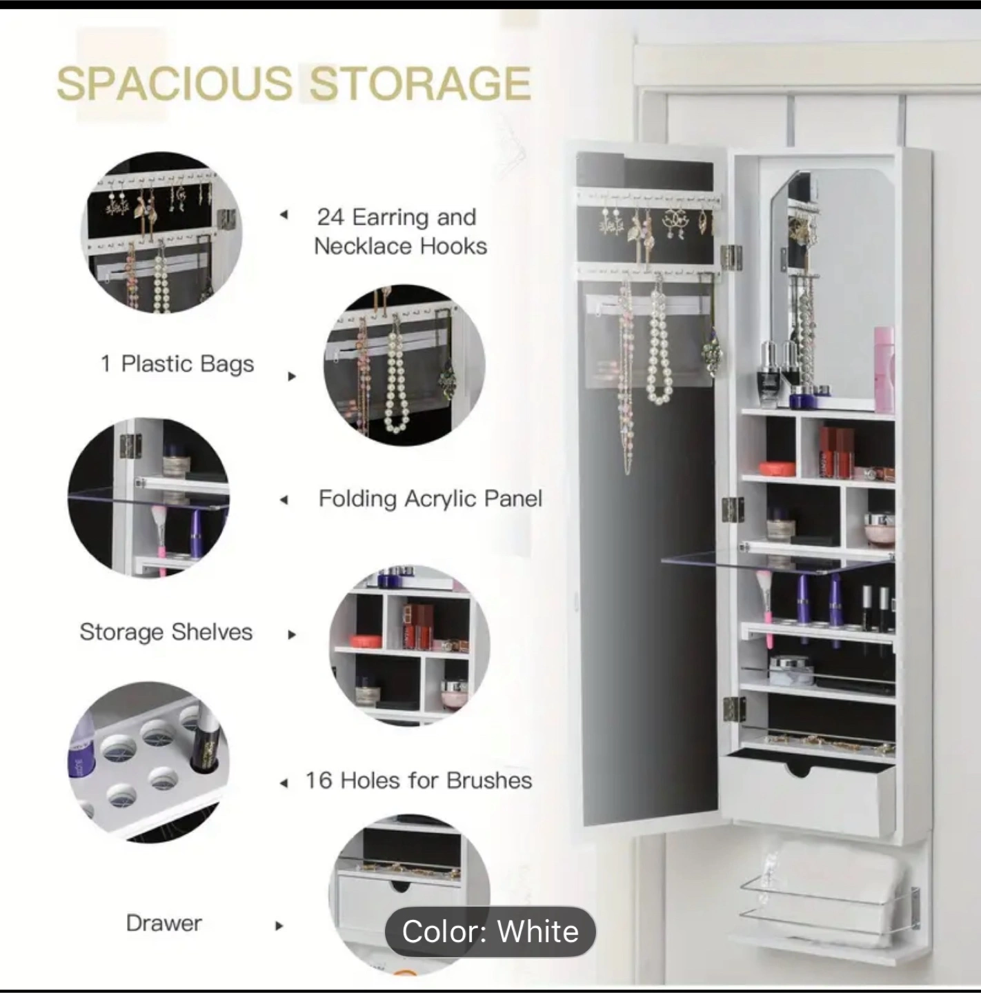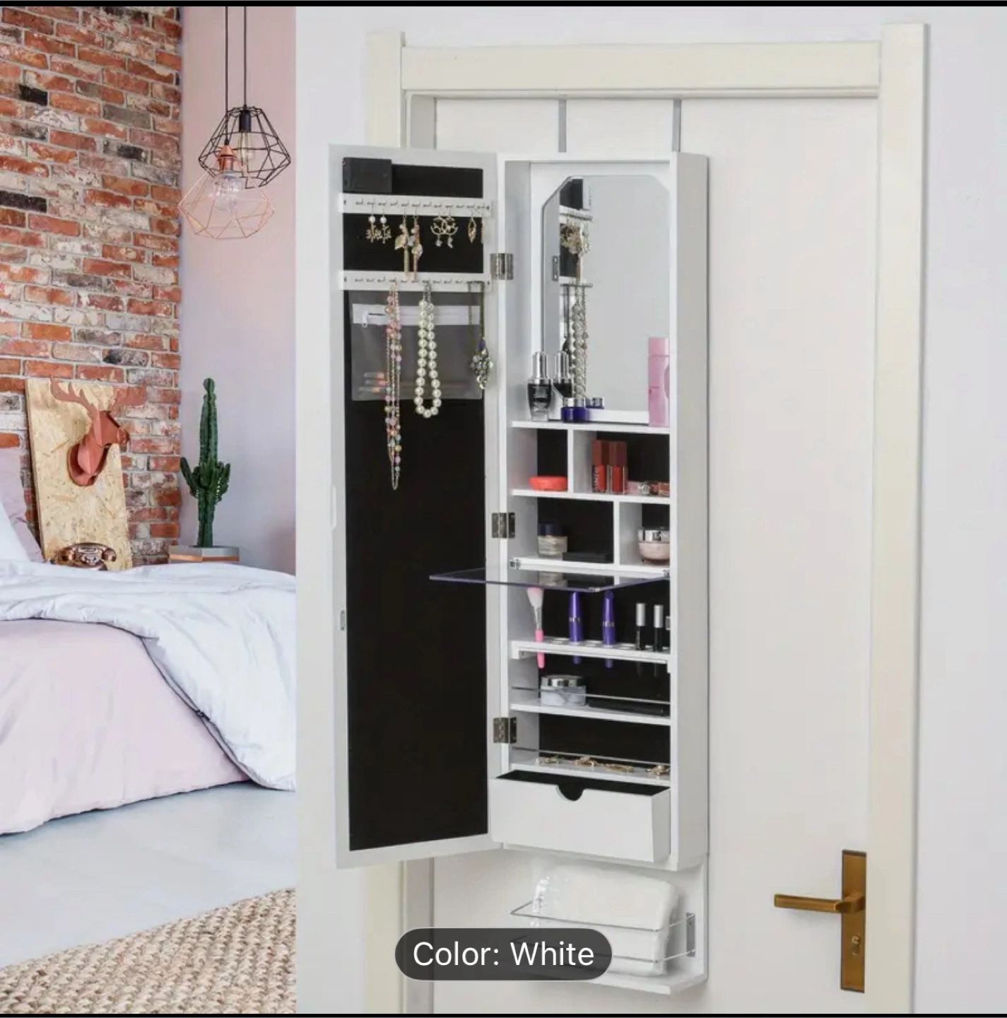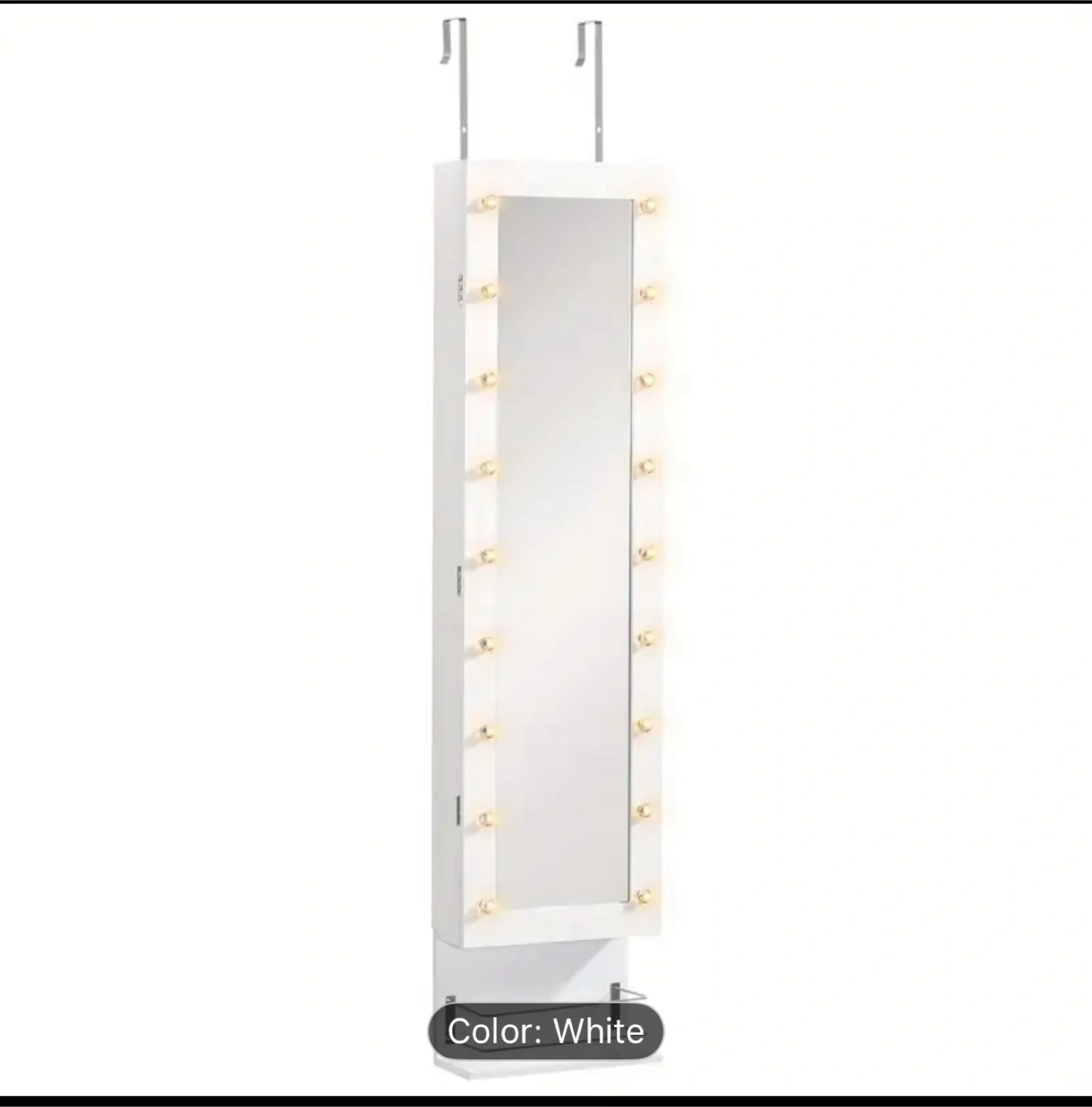 Selling a white jewelry armoire that can be mounted over-the-door or on the wall!