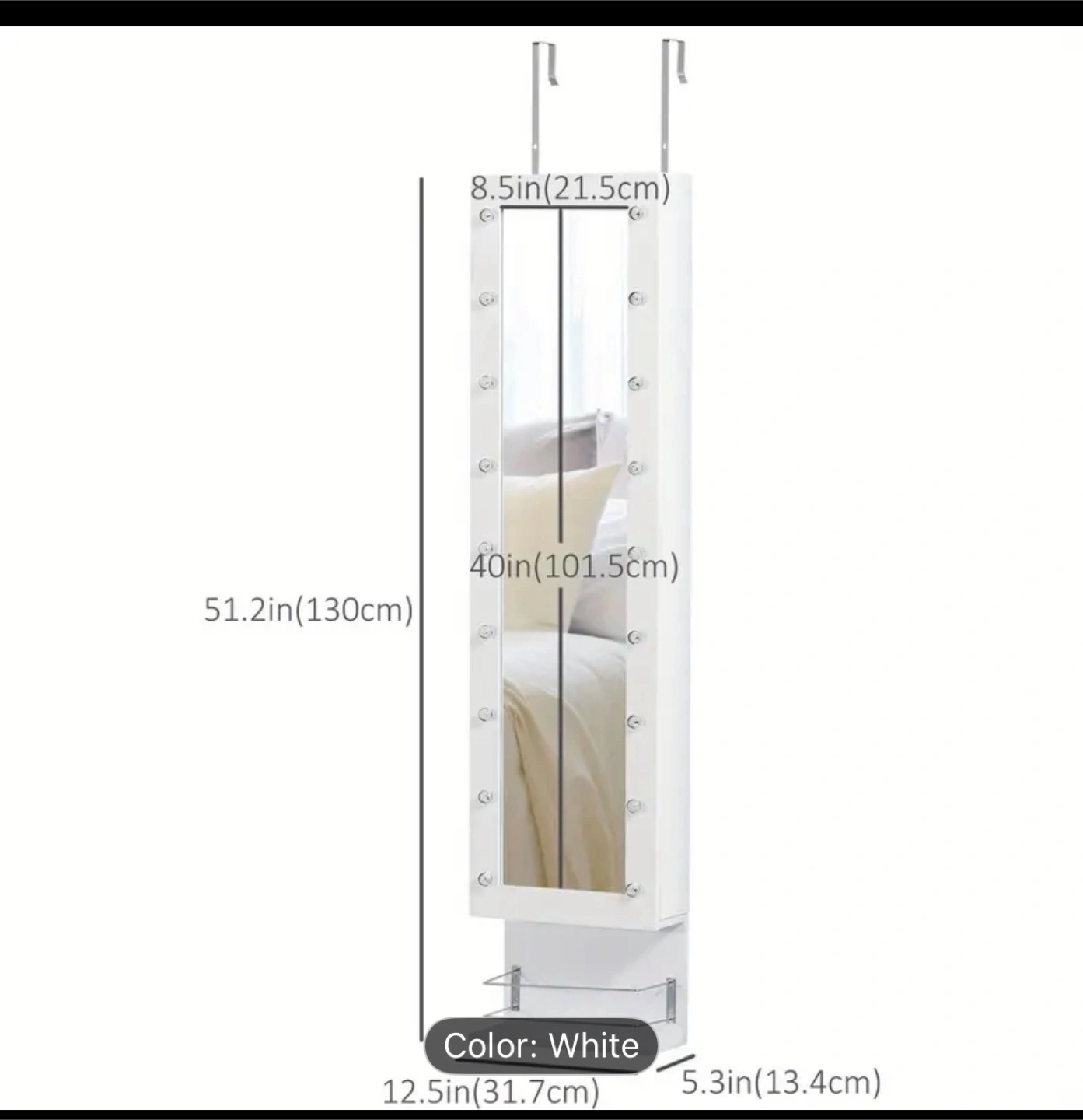 - Mirror: 40 inches (101.5 cm) x 8.5 inches (21.5 cm)