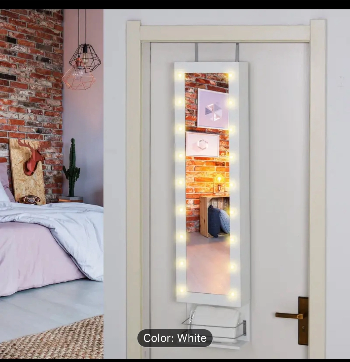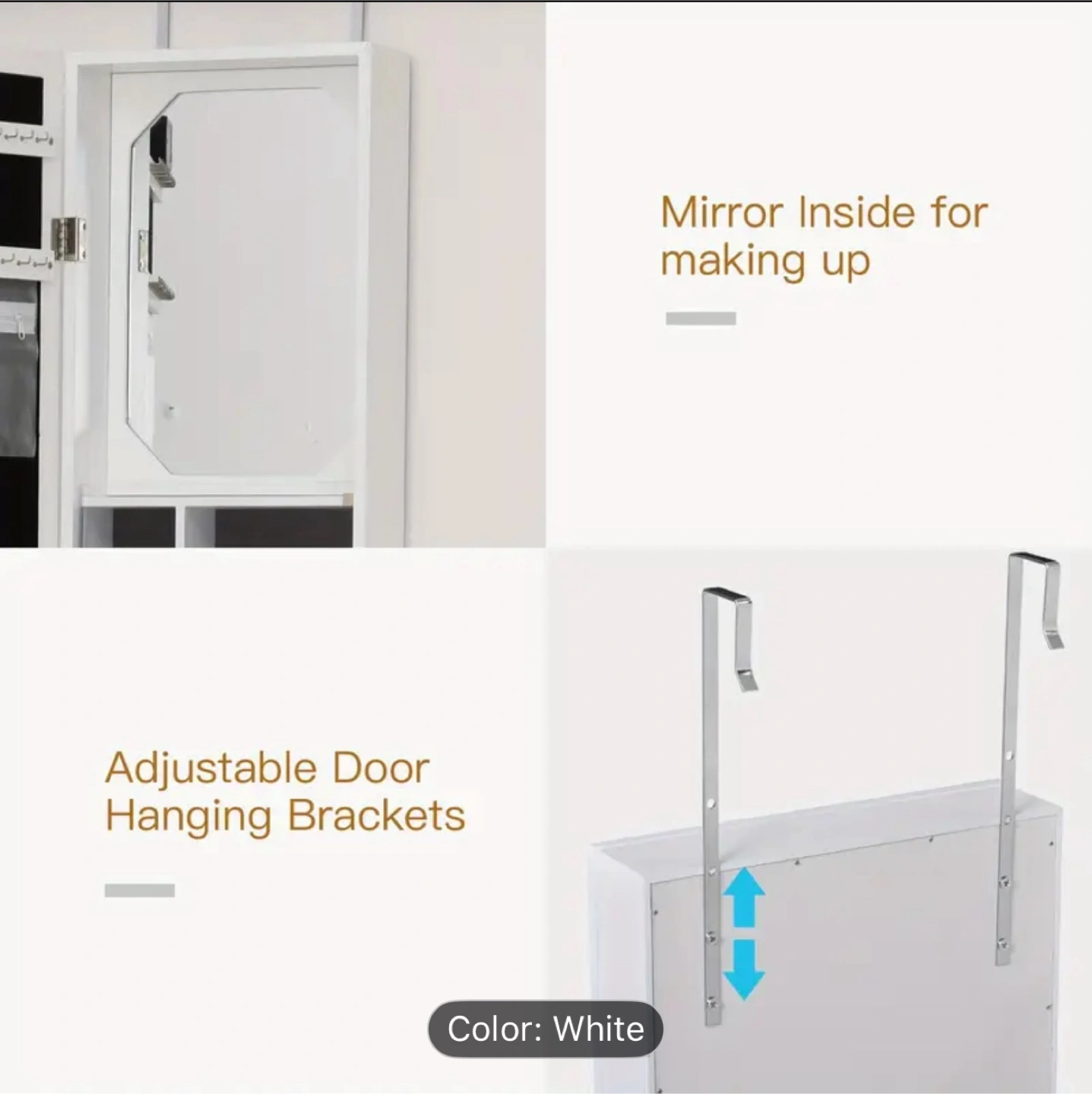 Selling a white jewelry armoire that can be mounted over-the-door or on the wall!