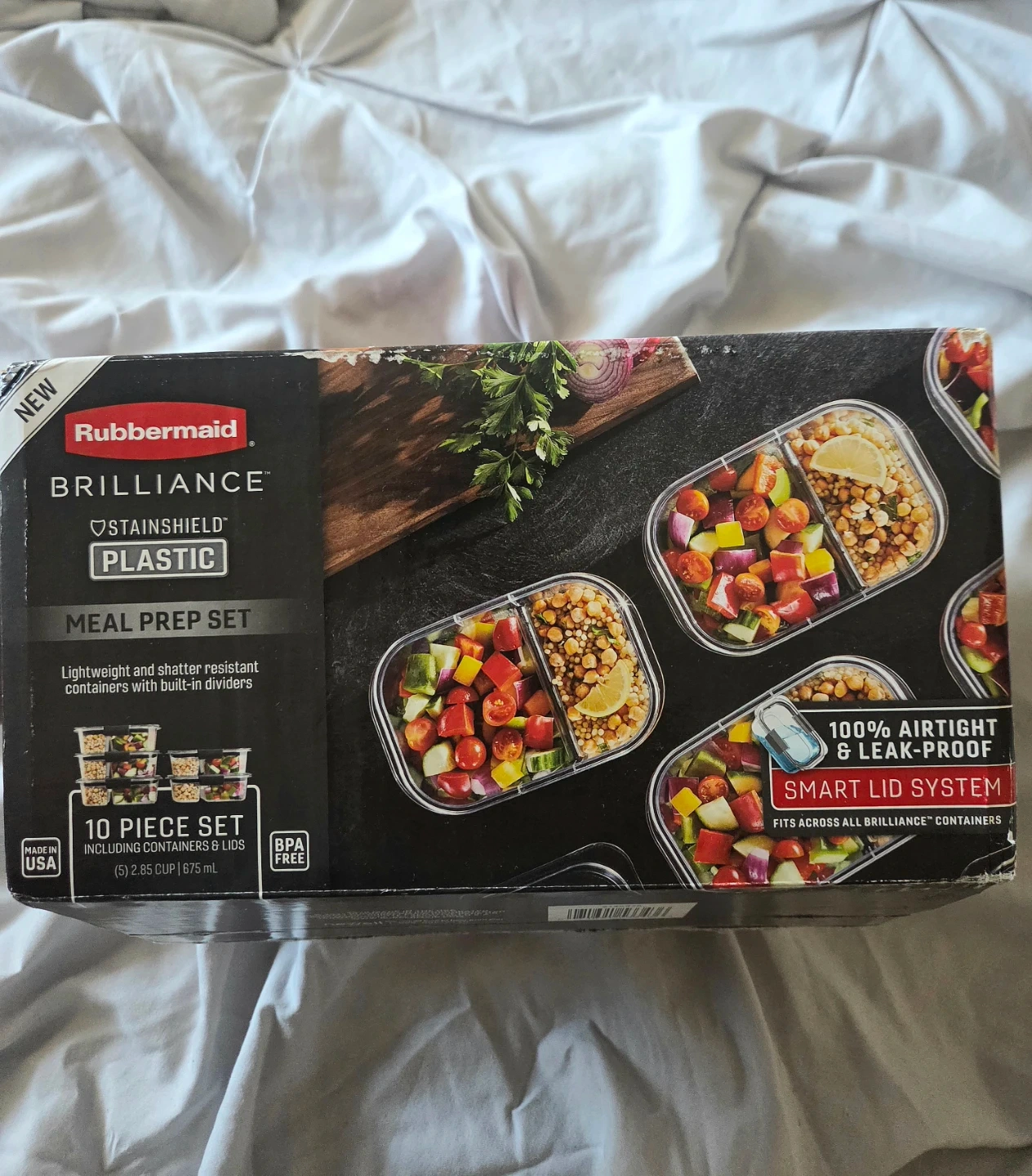 This is a 10-piece Rubbermaid Brilliance meal prep set including containers and lids. The containers are lightweight, shatter-resistant, and feature built-in dividers. They're BPA-free with a 100% airtight and leak-proof smart lid system. Each container is 2.85 cup (675 mL) capacity.