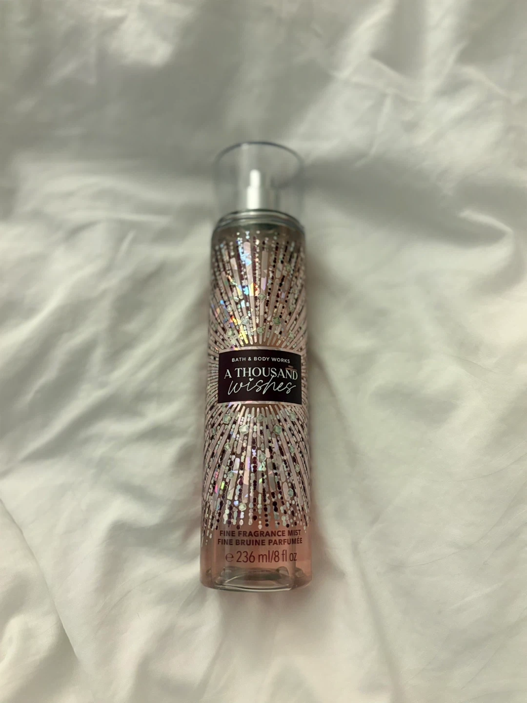 This is a Bath & Body Works A Thousand Wishes Fine Fragrance Mist. It's 236 ml or 8 fl oz. The mist is alcohol-based with a fragrance.