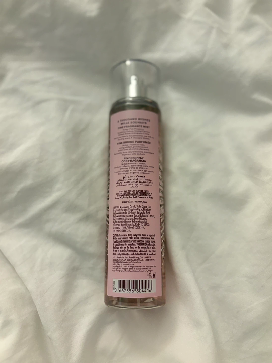 This is a Bath & Body Works A Thousand Wishes Fine Fragrance Mist. It's 236 ml or 8 fl oz. The mist is alcohol-based with a fragrance.