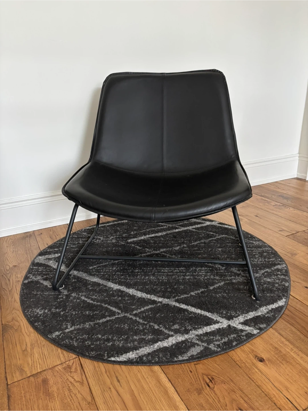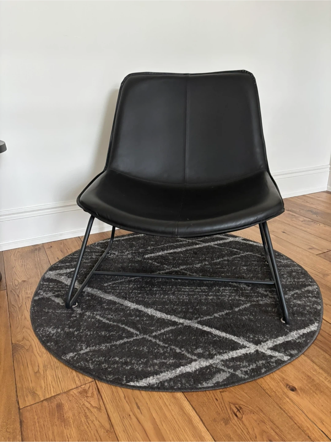 Selling a stylish black accent chair with a sleek faux leather finish! It's perfect for adding a modern touch to any room. The chair features a comfortable seat and a sturdy metal frame.