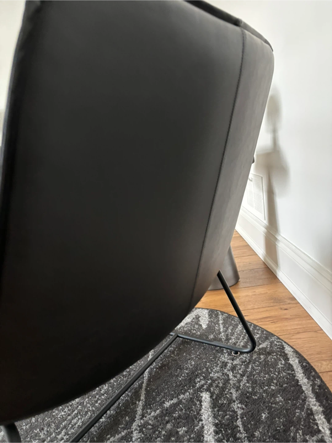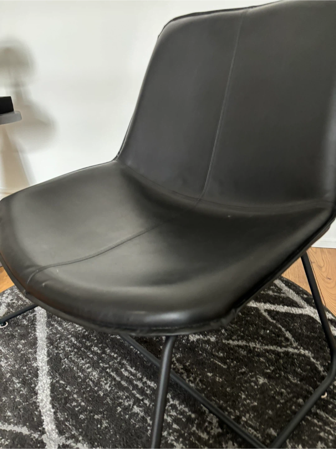 Selling a stylish black accent chair with a sleek faux leather finish! It's perfect for adding a modern touch to any room. The chair features a comfortable seat and a sturdy metal frame.