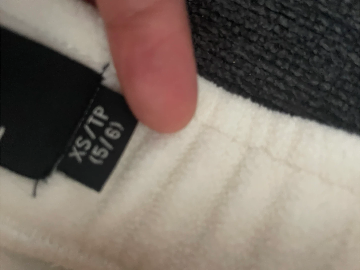 Cream-coloured fleece joggers with reinforced hoodie. Includes a drawstring waist and elasticated cuffs. Size XS/TP (5/6).