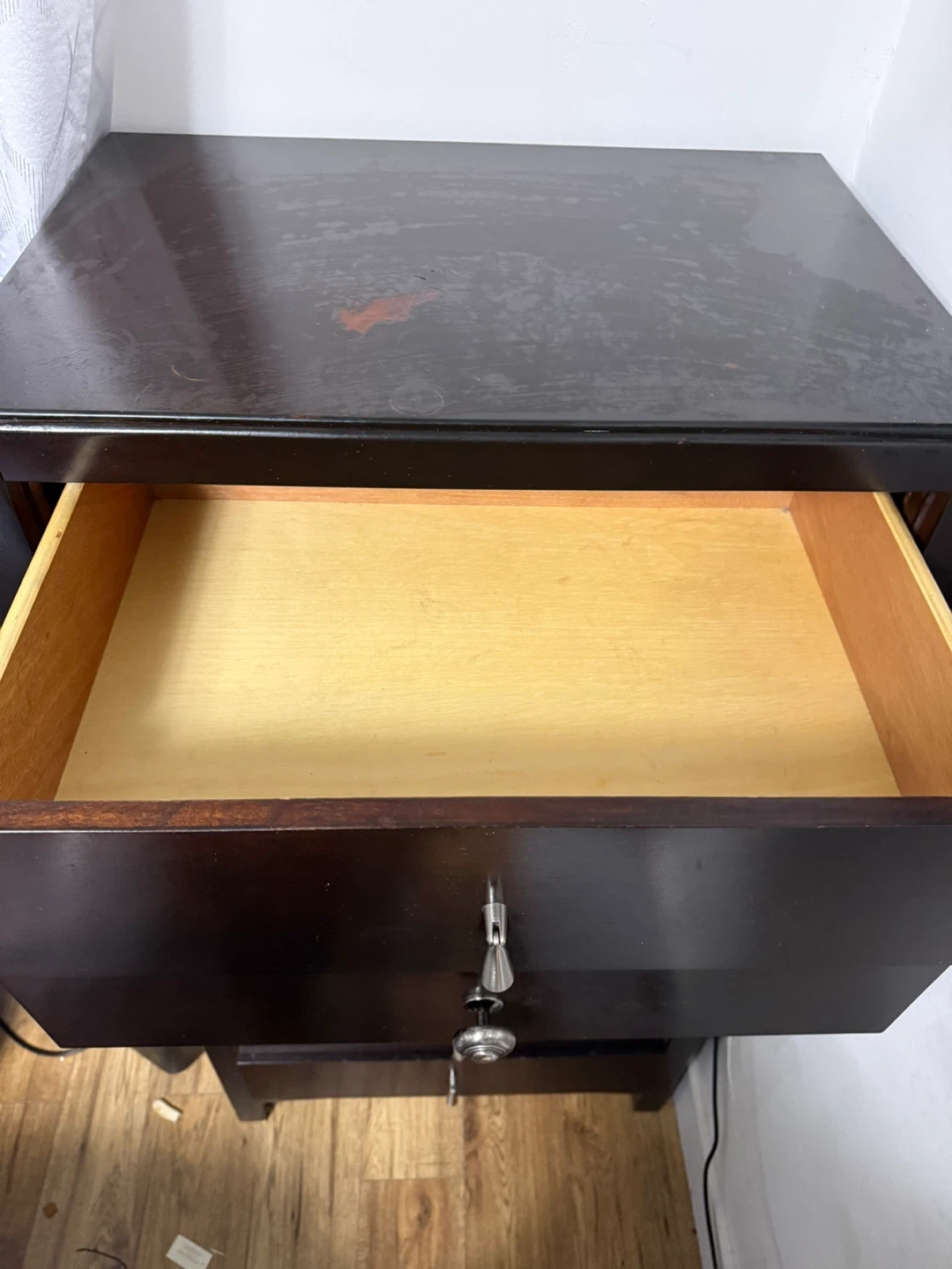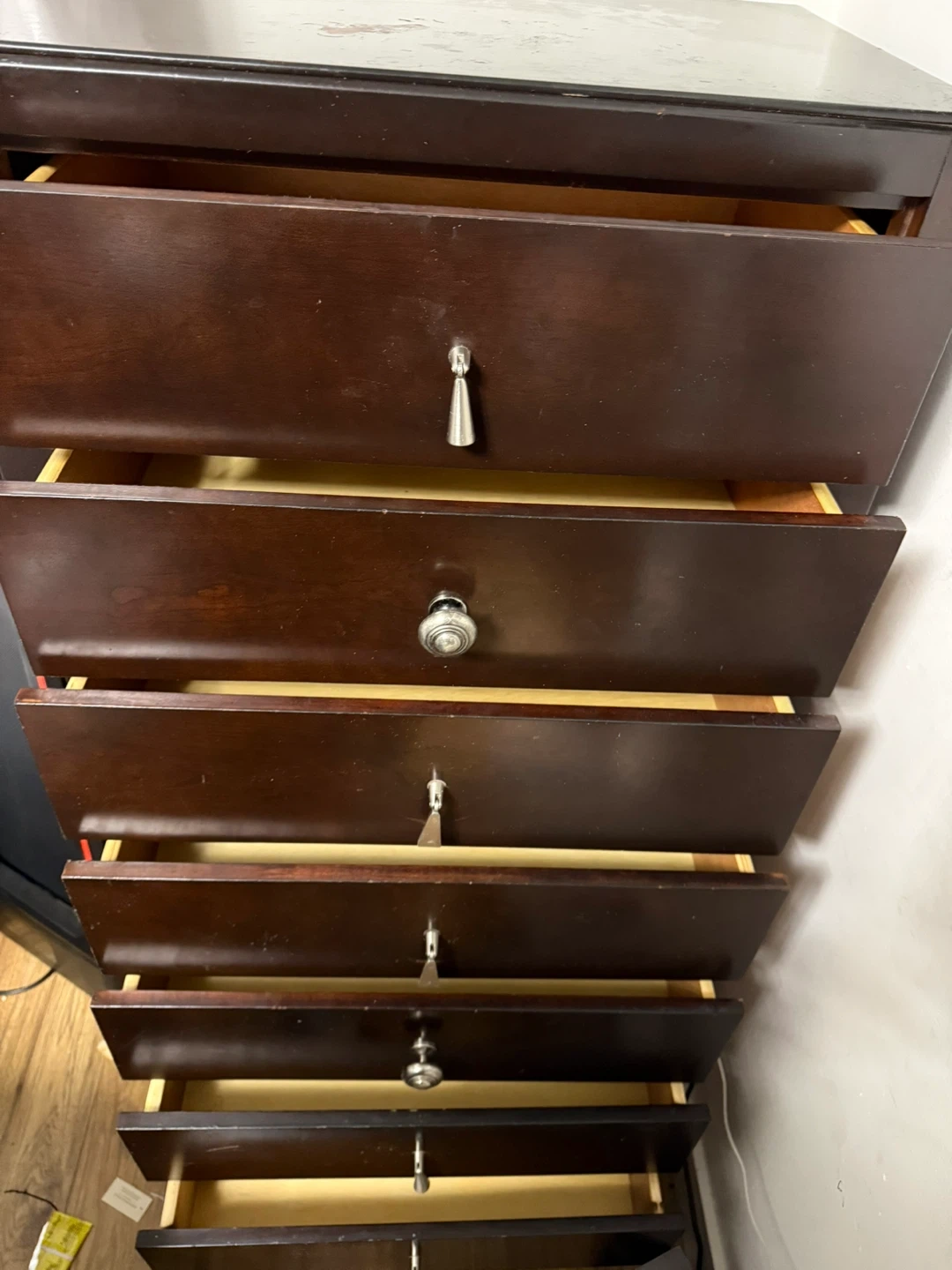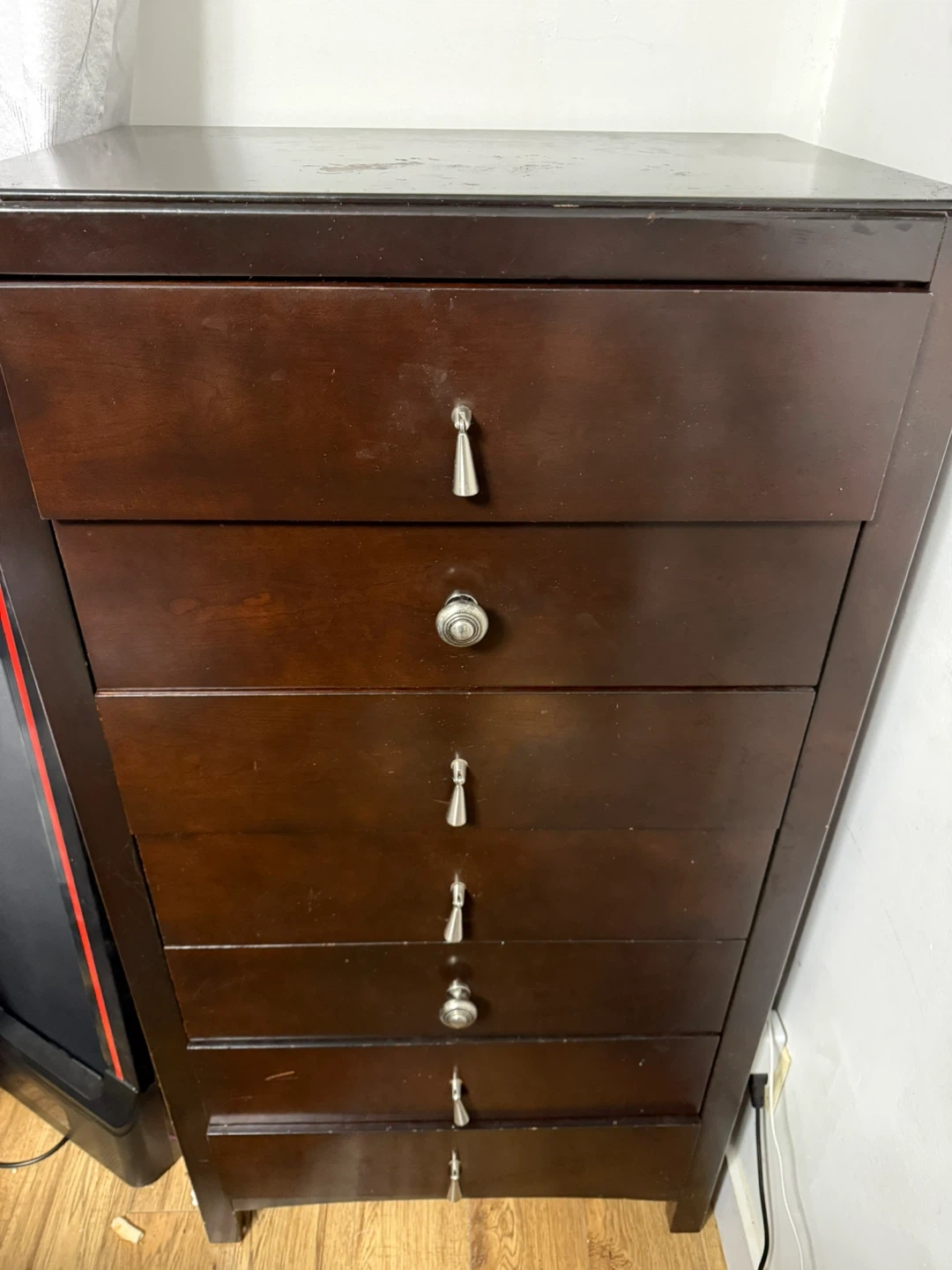 Here's a dark brown wooden dresser with seven drawers. It's perfect for adding storage to any bedroom or living space. The dresser is in good condition and ready for a new home!
