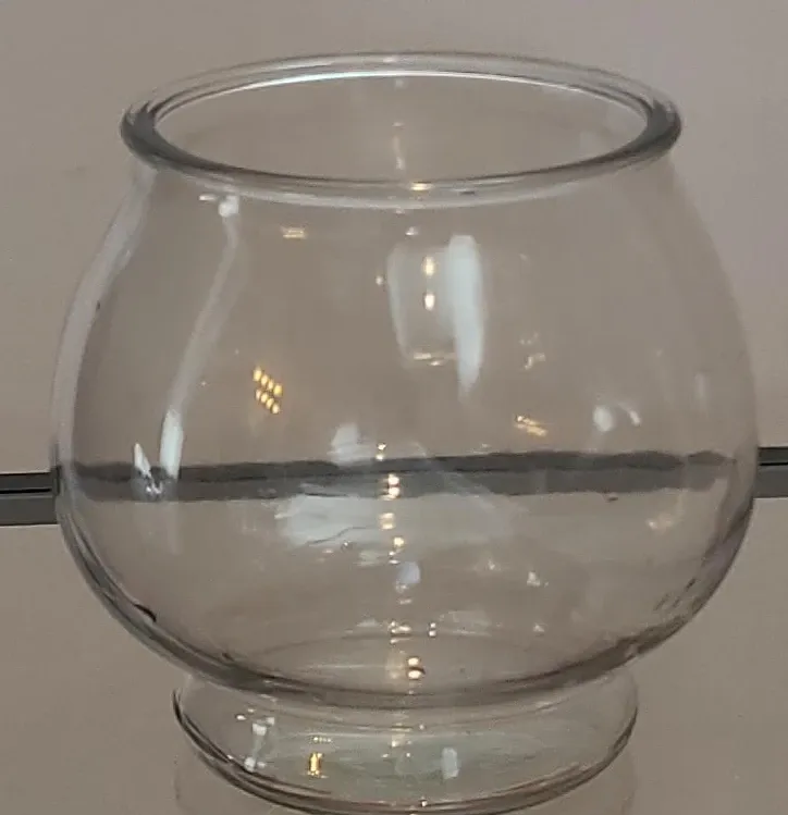 A charming clear glass bud vase or fish bowl. It's made of glass and features a unique rounded shape with a stable base. Perfect for a single flower or a small bouquet!