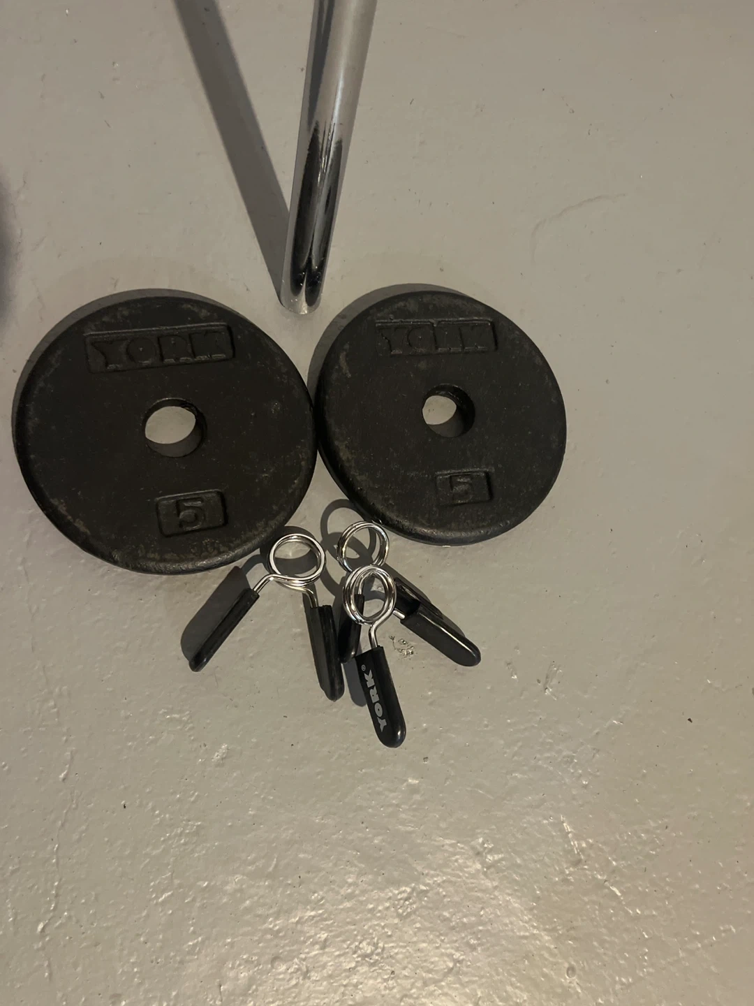York 2 x 5lb Weight Plates, Barbell, and Clips