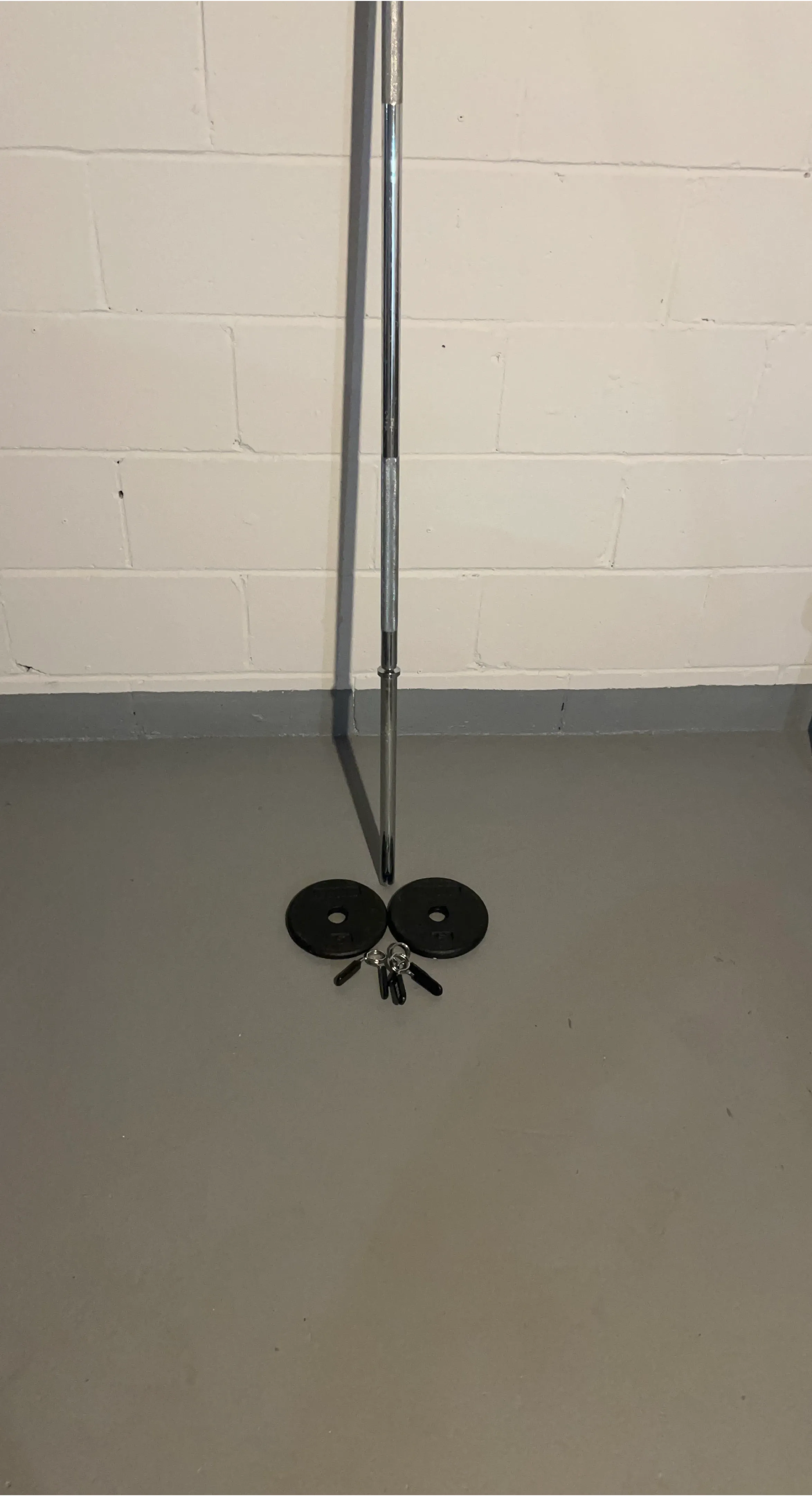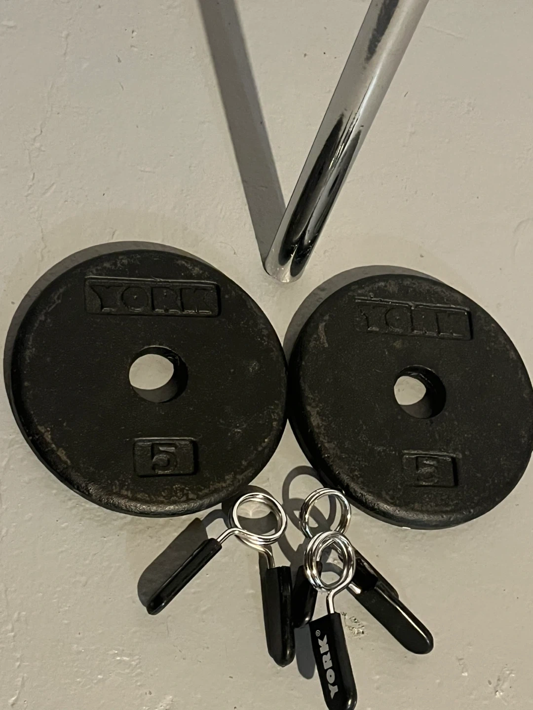 York 2 x 5lb Weight Plates, Barbell, and Clips