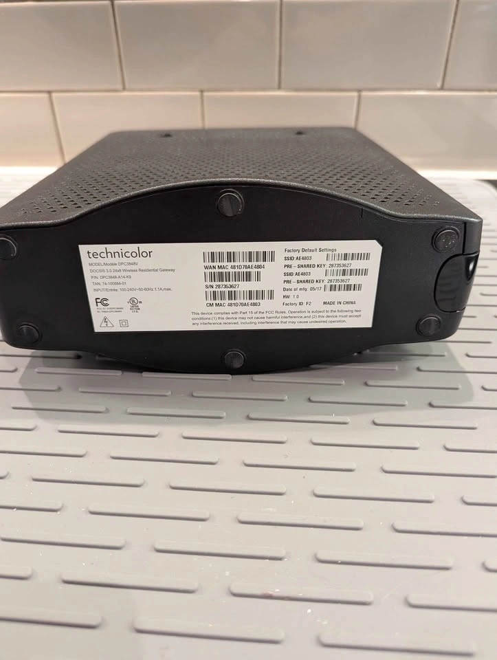 Upgrade your home network with this reliable Technicolor DPC3848V Wireless Residential Gateway. This is a versatile 3-in-1 device that functions as a cable modem, high-speed router, and wireless access point. Key Features: Fast Performance: Features 24x8 channel bonding for high-speed internet connectivity, supporting download speeds up to 900 Mbps. Dual-Band Wi-Fi: Provides both 2.4 GHz and 5 GHz networks for better coverage and reduced interference. Connectivity: Includes 4 Gigabit Ethernet (LAN) ports for lightning-fast wired connections to gaming consoles or PCs. Advanced Security: Built-in firewall (Stateful Packet Inspection) to keep your home network secure. Compatibility: This model is widely used with major Canadian cable providers such as Rogers, Shaw, Cogeco, Teksavvy, and other TPIA providers. Note: Please check with your specific Internet Service Provider (ISP) to ensure they can activate this specific model on your plan. Condition: Excellent condition and fully operational. Factory reset and ready for its new owner. Includes power adapter.