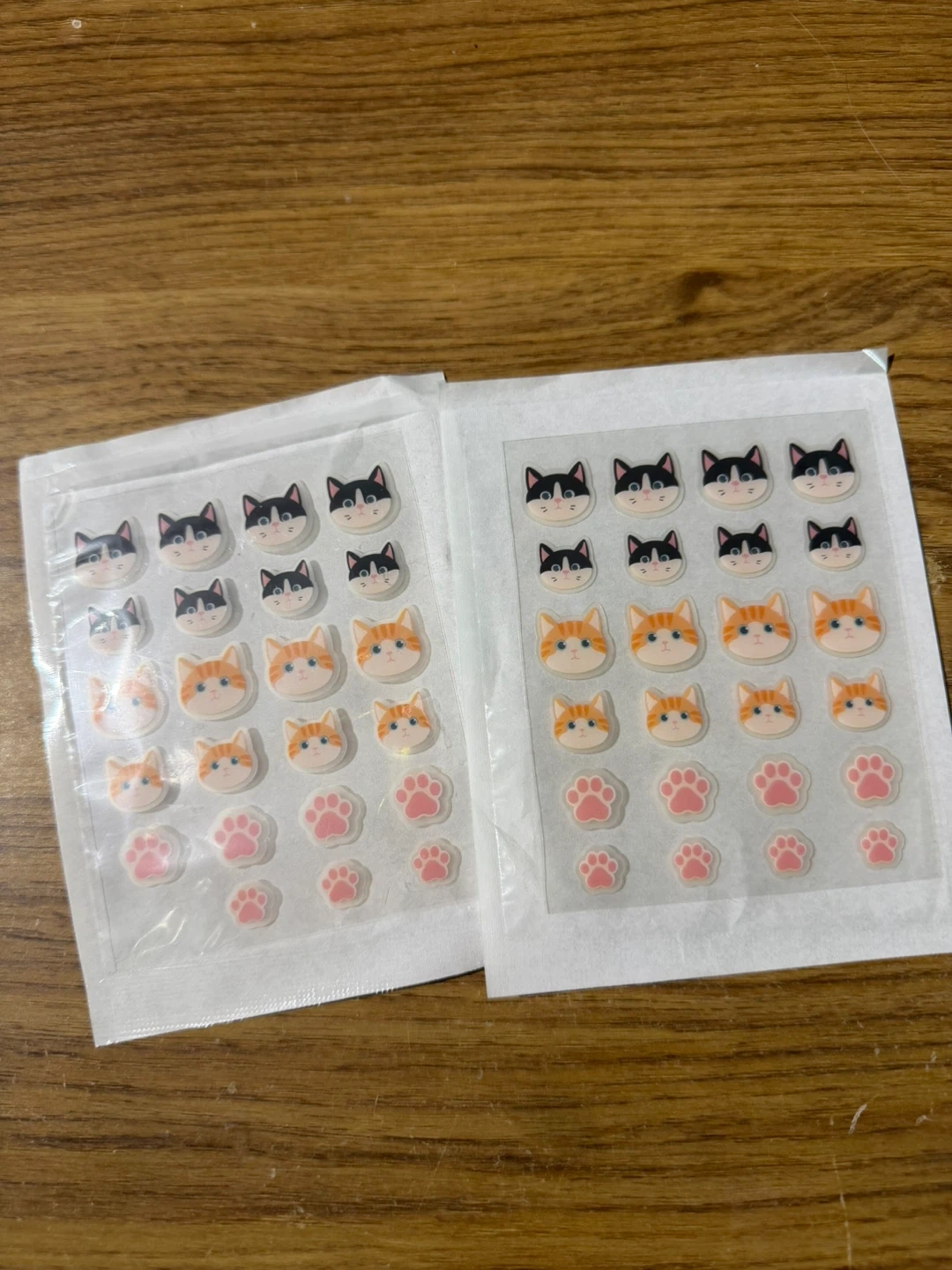 Two sheets of cute stickers featuring various cat faces and paw prints. Great for decorating journals, planners, or crafts!