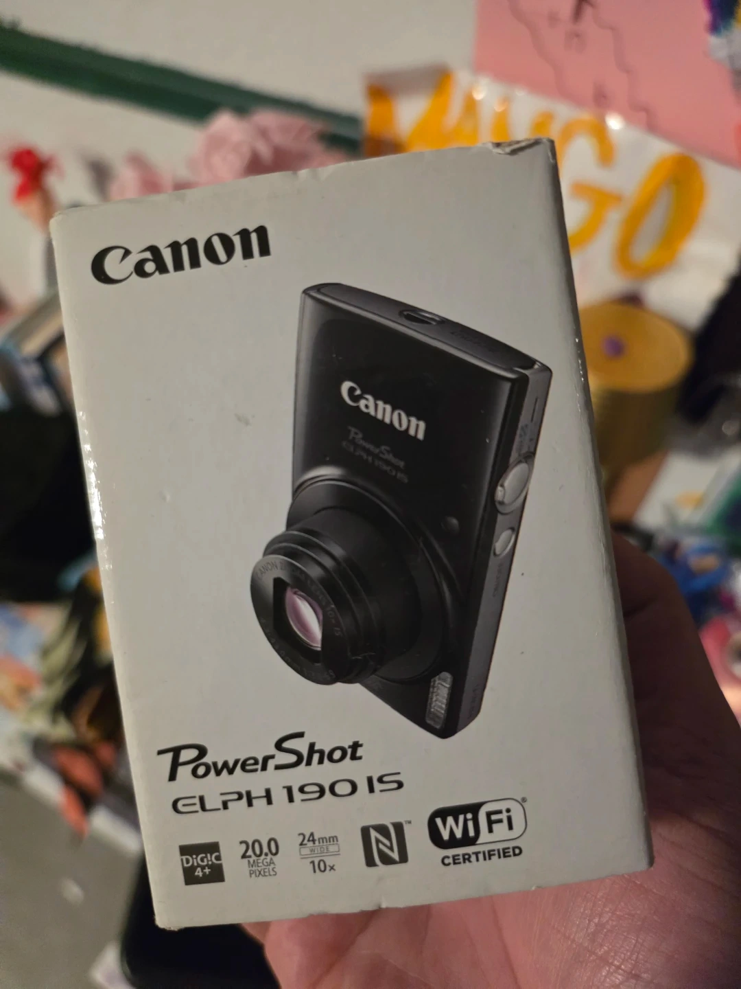 This is a Canon PowerShot ELPH 190 IS digital camera. It features 20.0 megapixels and 10x optical zoom. It's also Wi-Fi certified.