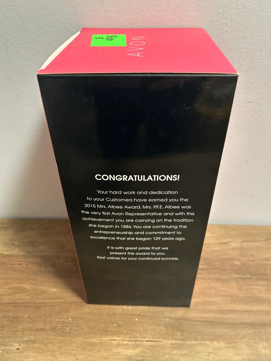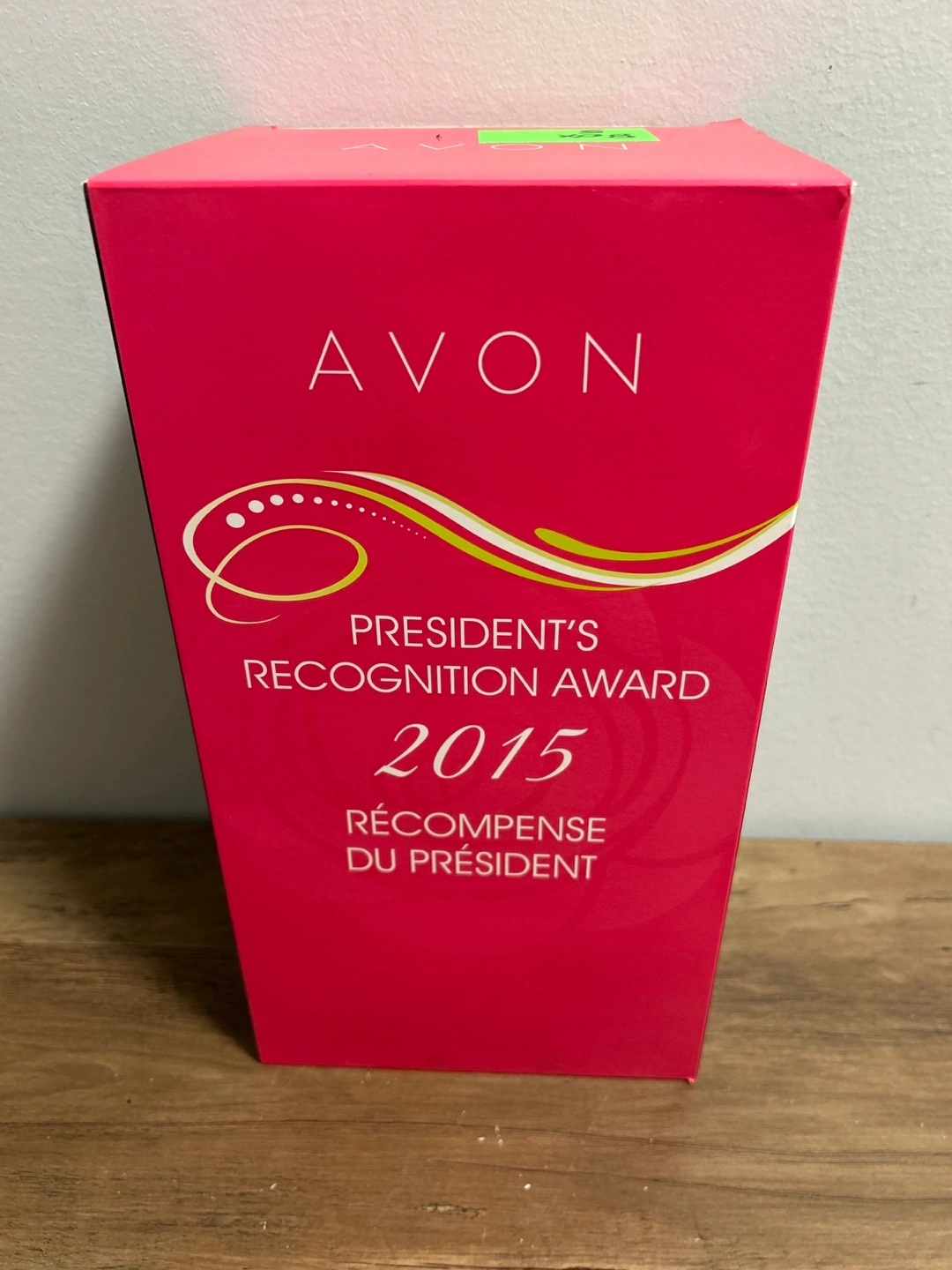 This is the Avon President's Recognition Award from 2015. It's a figurine recognizing an Avon Representative's hard work and dedication. It comes in its original box. Congratulations to the recipient!