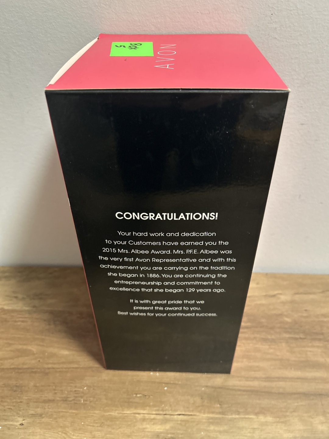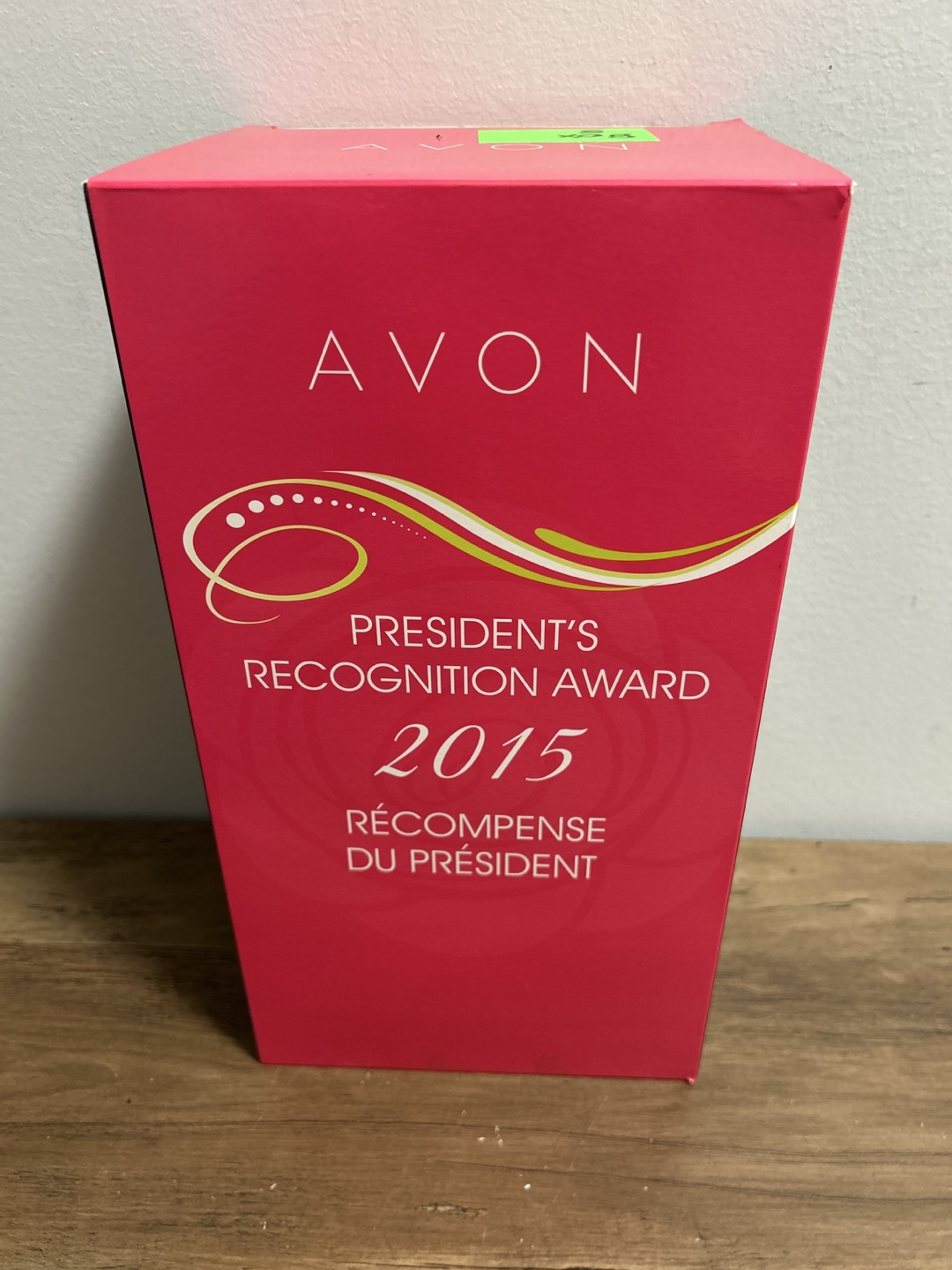 This is the Avon President's Recognition Award from 2015. It's a figurine recognizing an Avon Representative's hard work and dedication. It comes in its original box. Congratulations to the recipient!