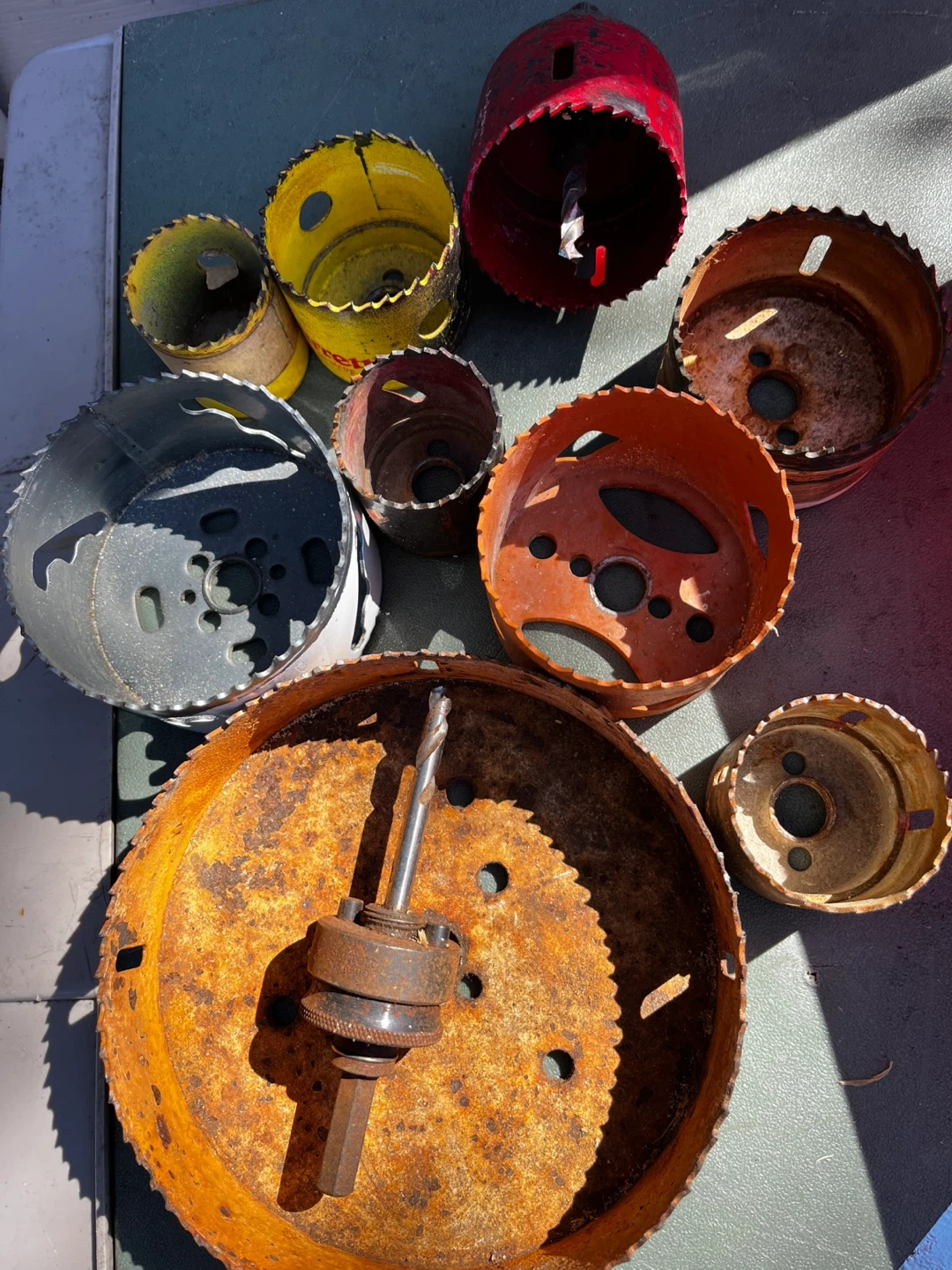 This is a collection of various hole saws. Includes multiple sizes and an arbor with a pilot drill bit. These are for cutting holes in various materials.