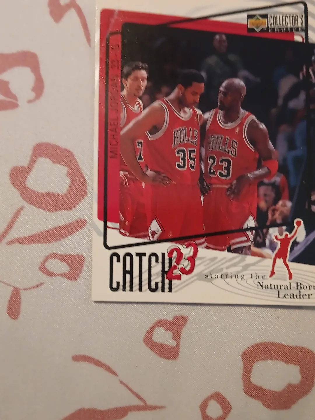 This is a Collector's Choice trading card featuring Michael Jordan with the Chicago Bulls. It's part of the 'Catch 23' series. The card highlights Michael Jordan, Scottie Pippen, and Dennis Rodman.