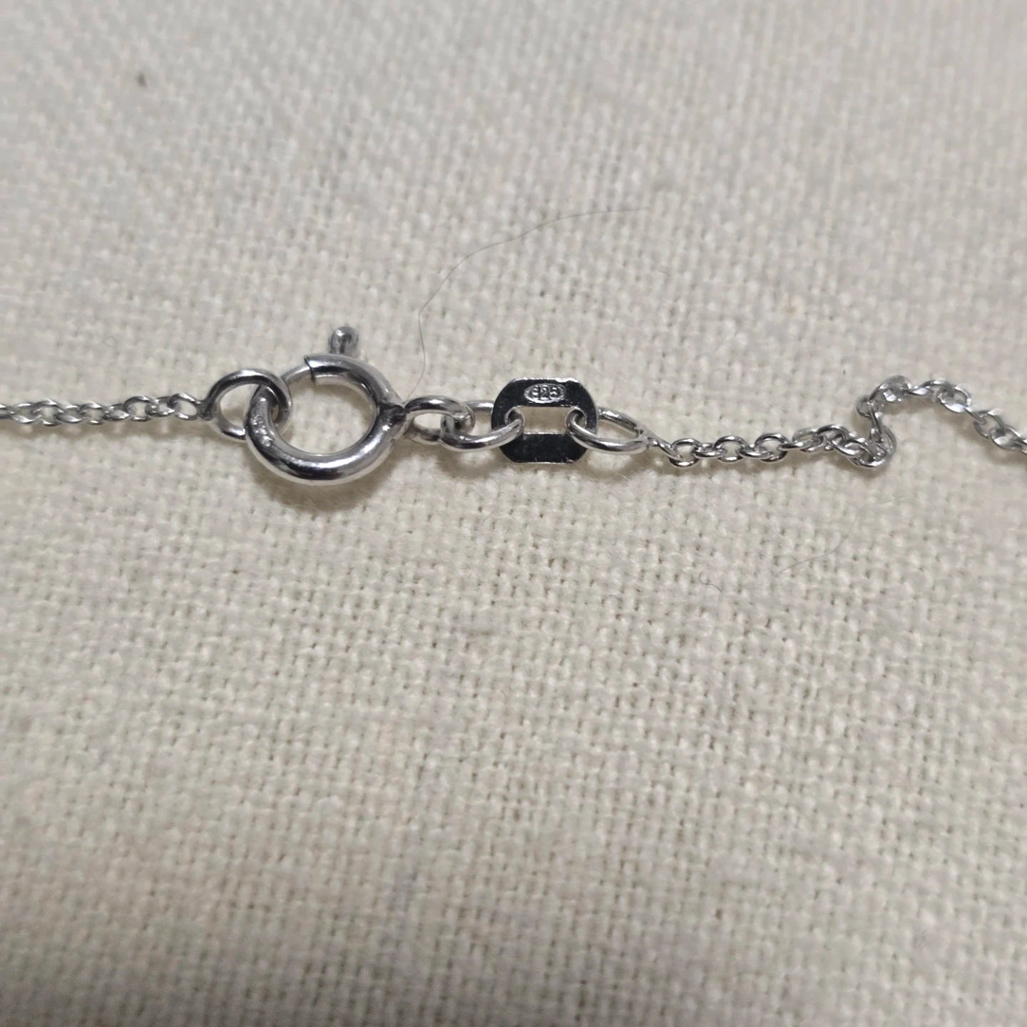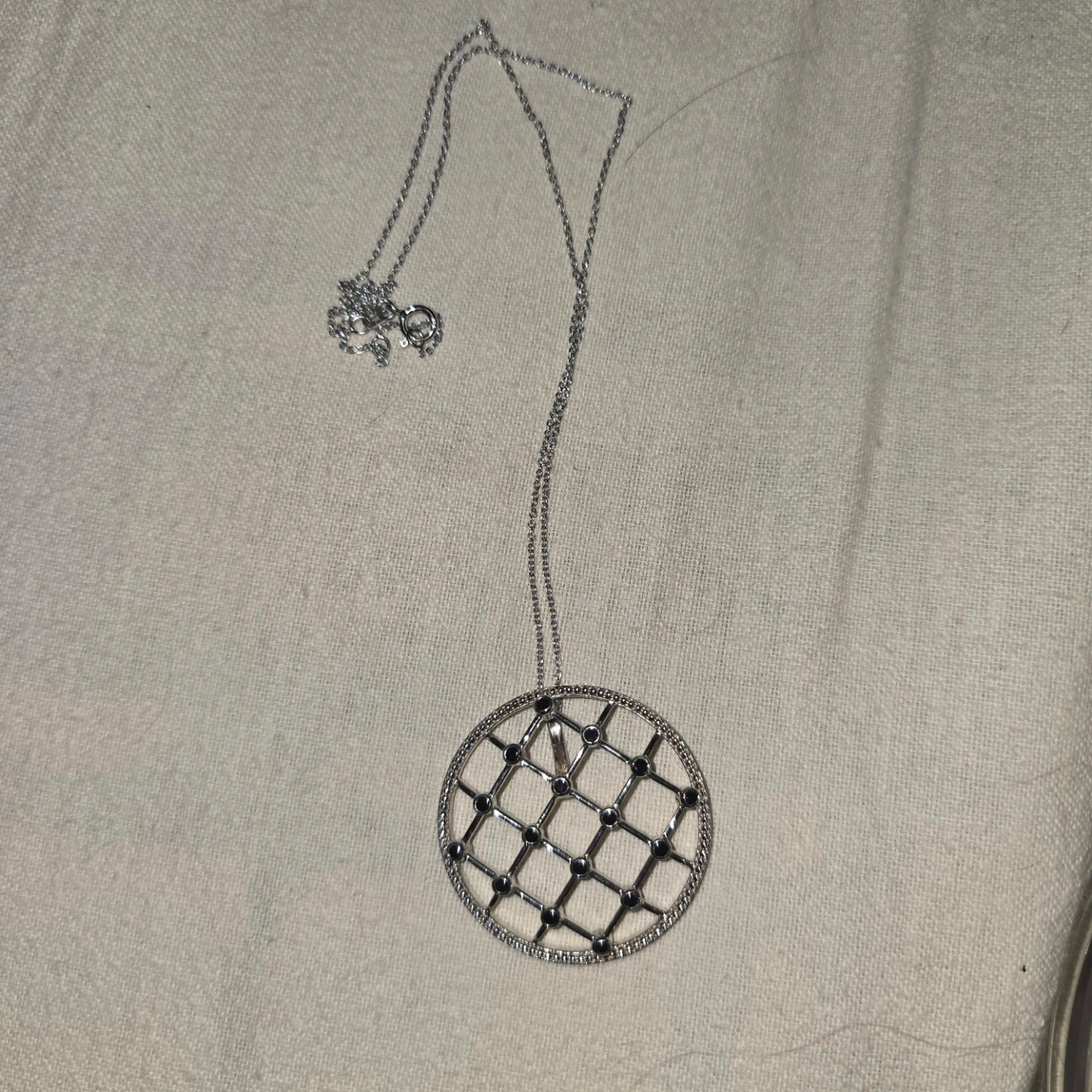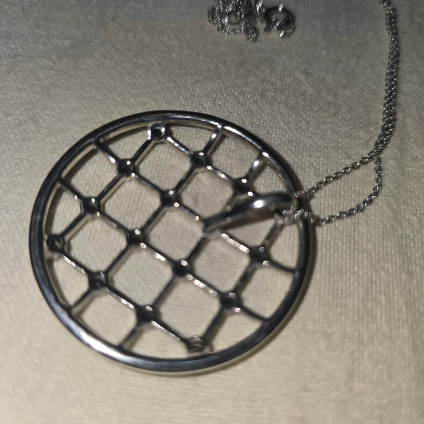 This is a silver-tone necklace with a round pendant. The pendant has a grid-like design with small, dark accents at each intersection. It's a stylish and eye-catching piece!