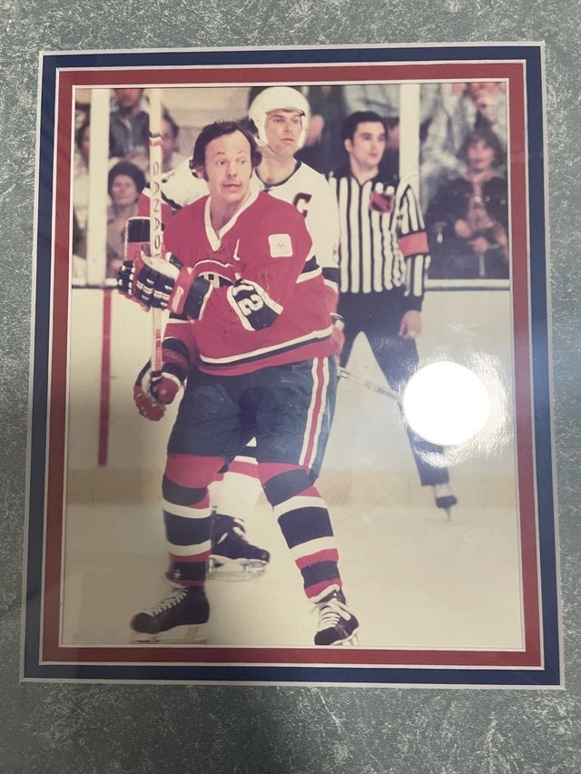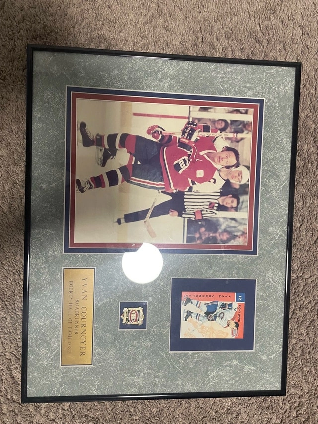 Selling a framed Montreal Canadiens collectible featuring Yvan Cournoyer. This piece includes a classic action photo, a commemorative plaque (Hockey Hall of Fame 1982), a vintage-style hockey card, and a badge, all professionally displayed in one frame. Perfect for hockey fans or collectors, especially supporters of the Canadiens. The frame is in good condition and makes a great wall piece for a room, office, or sports setup.