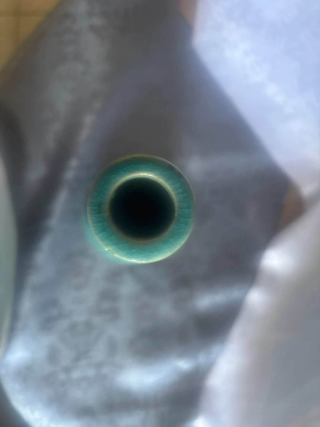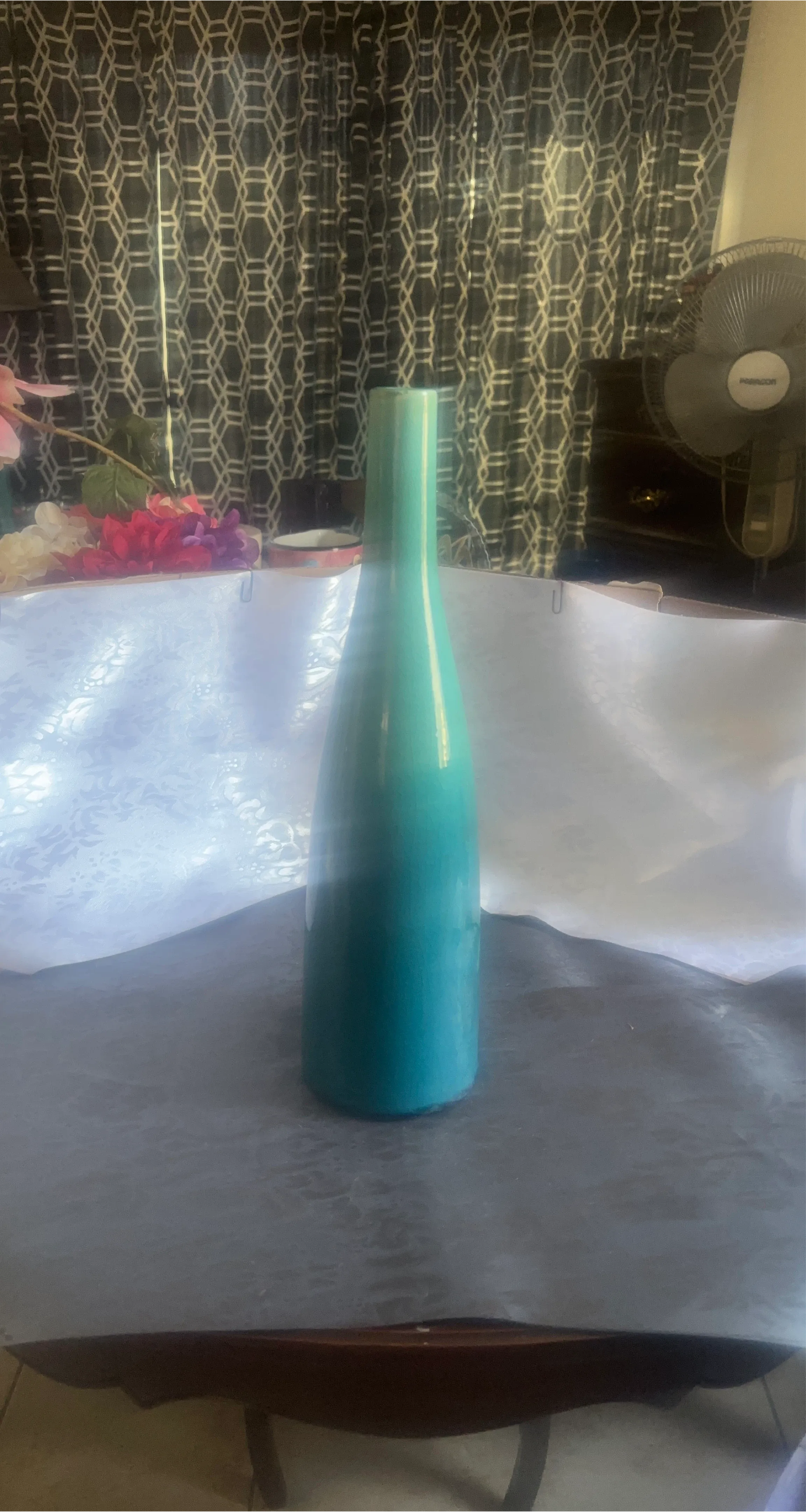 This is a tall, teal ceramic vase with a glossy finish. It's approximately 12 inches tall and has a narrow opening. Great for displaying dried flowers or as a decorative piece!
