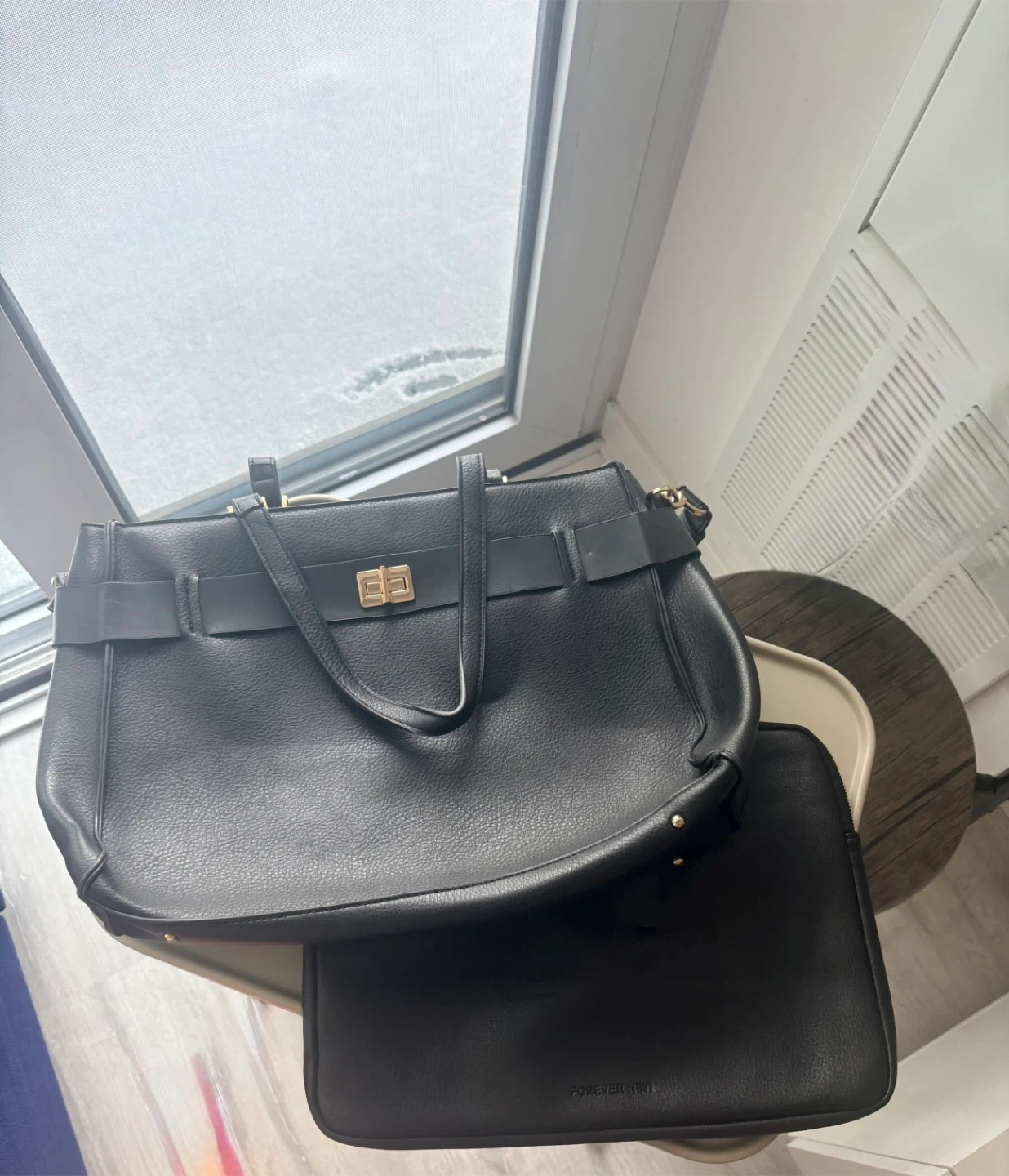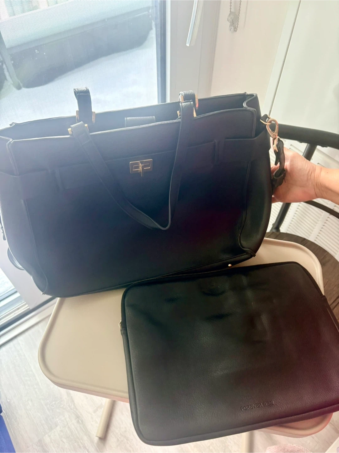 Black Faux Leather Tote Bag with Laptop Sleeve