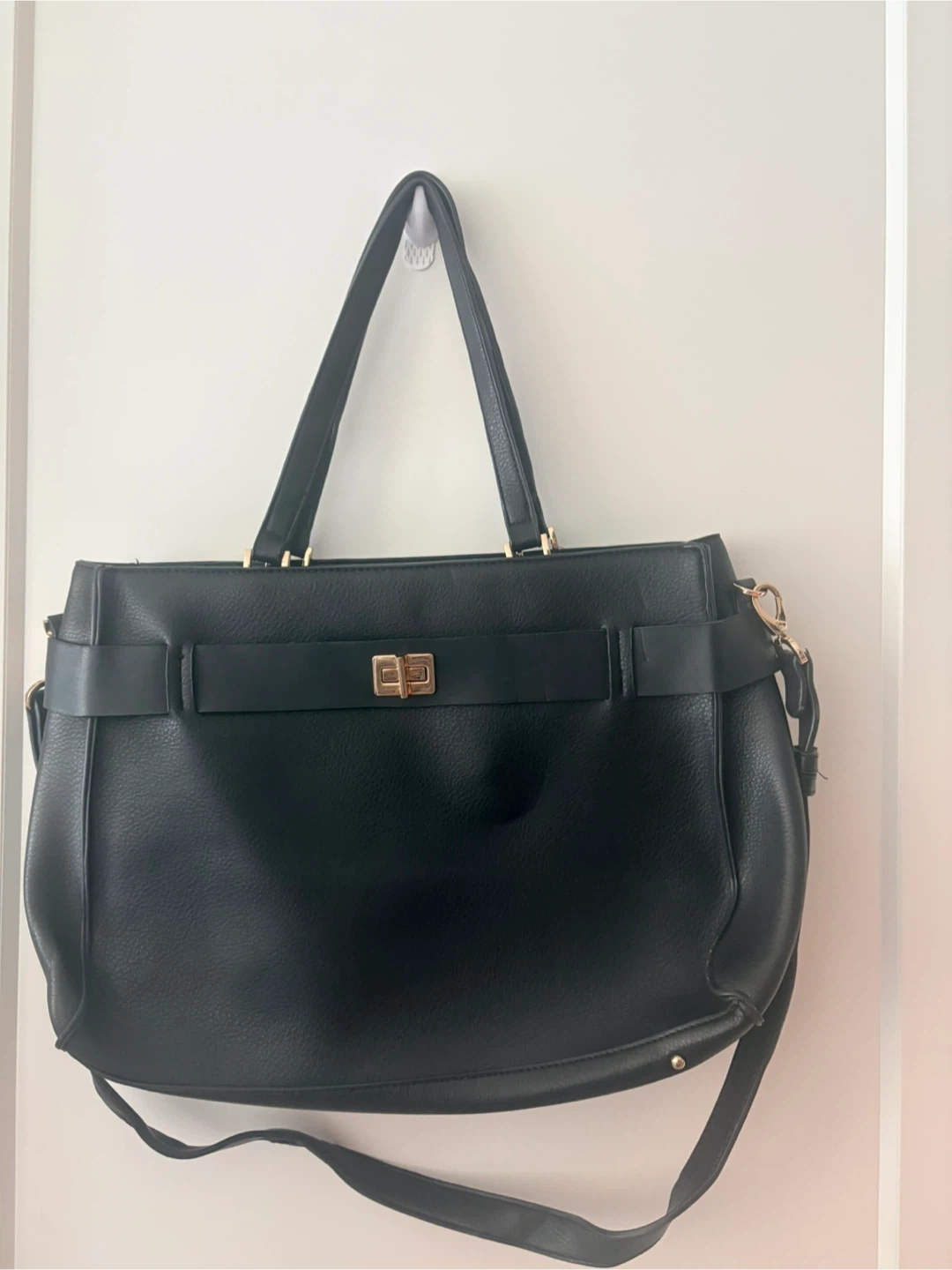 This stylish black tote bag includes a matching laptop sleeve. It features a secure gold-tone clasp closure and multiple carrying options with its top handles and detachable shoulder strap. This bag's spacious interior is perfect for carrying daily essentials.