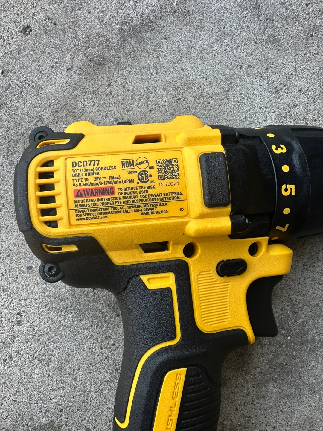 This is a DEWALT 20V MAX cordless drill/driver. It features a brushless motor for increased efficiency and longer run time. It has a variable speed trigger with a range of 0-500 RPM (low) and 0-1750 RPM (high).
