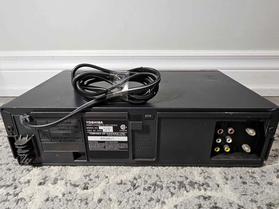 Toshiba VHS VCR with 4-head Hi-Fi stereo sound. Includes front AV inputs for easy connection. Good for playing old VHS tapes or retro setups.