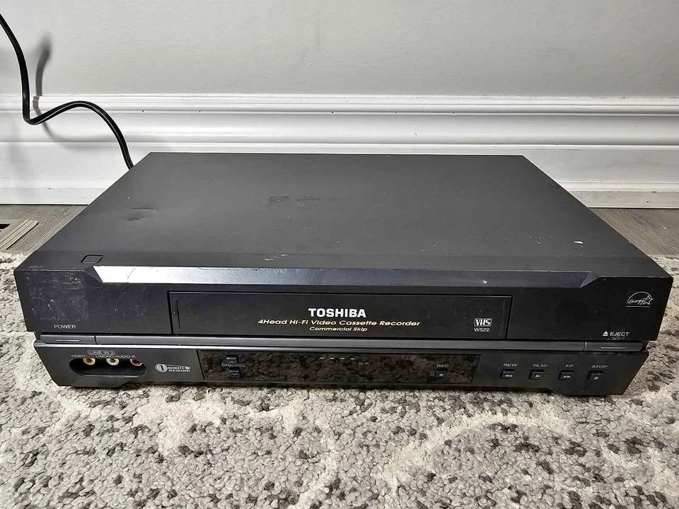 Toshiba VHS VCR with 4-head Hi-Fi stereo sound. Includes front AV inputs for easy connection. Good for playing old VHS tapes or retro setups.