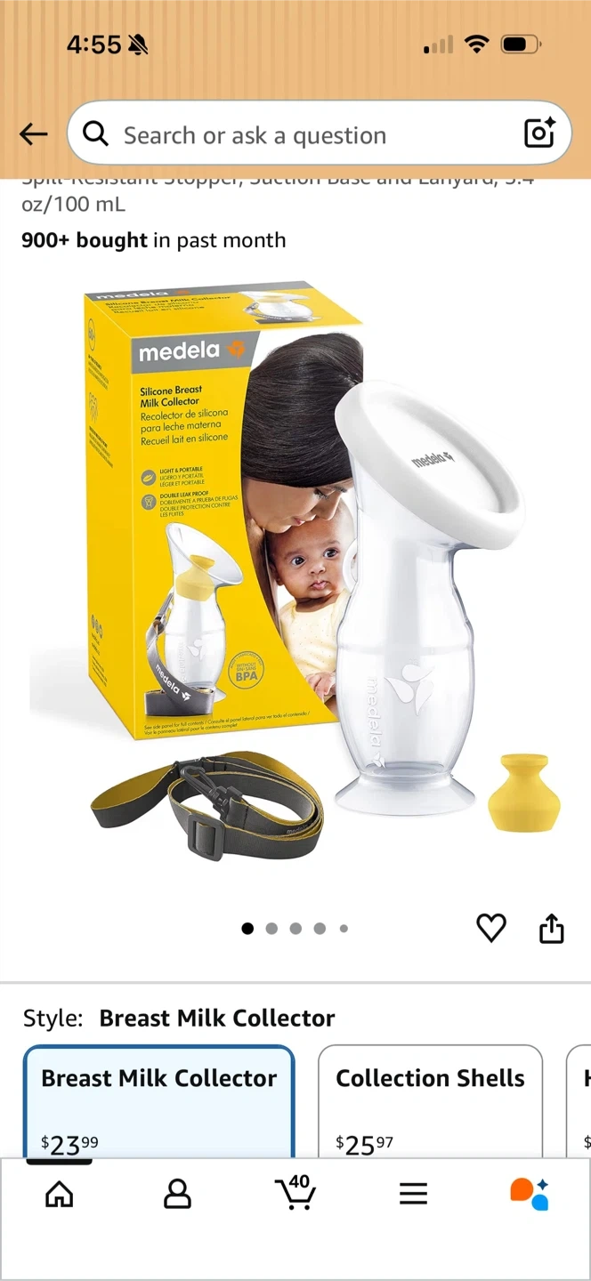 This Medela silicone breast milk collector is BPA-free. It includes a spill-resistant stopper, suction base, and lanyard. It holds 5.4 oz or 100 mL.