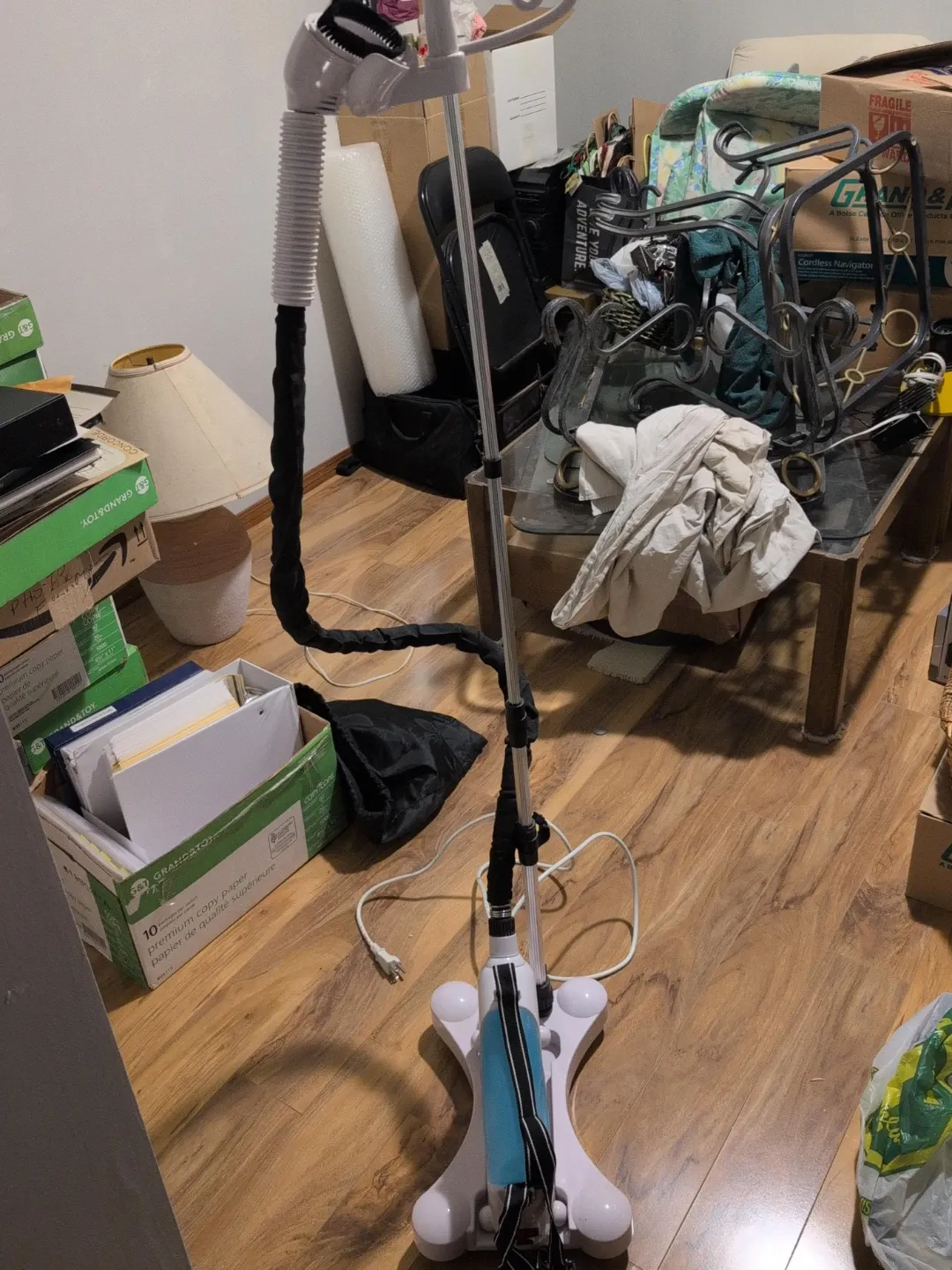 A vertical garment steamer with a flexible hose and brush attachment. It has a stable base and a power cord. Ideal for quickly refreshing clothes.