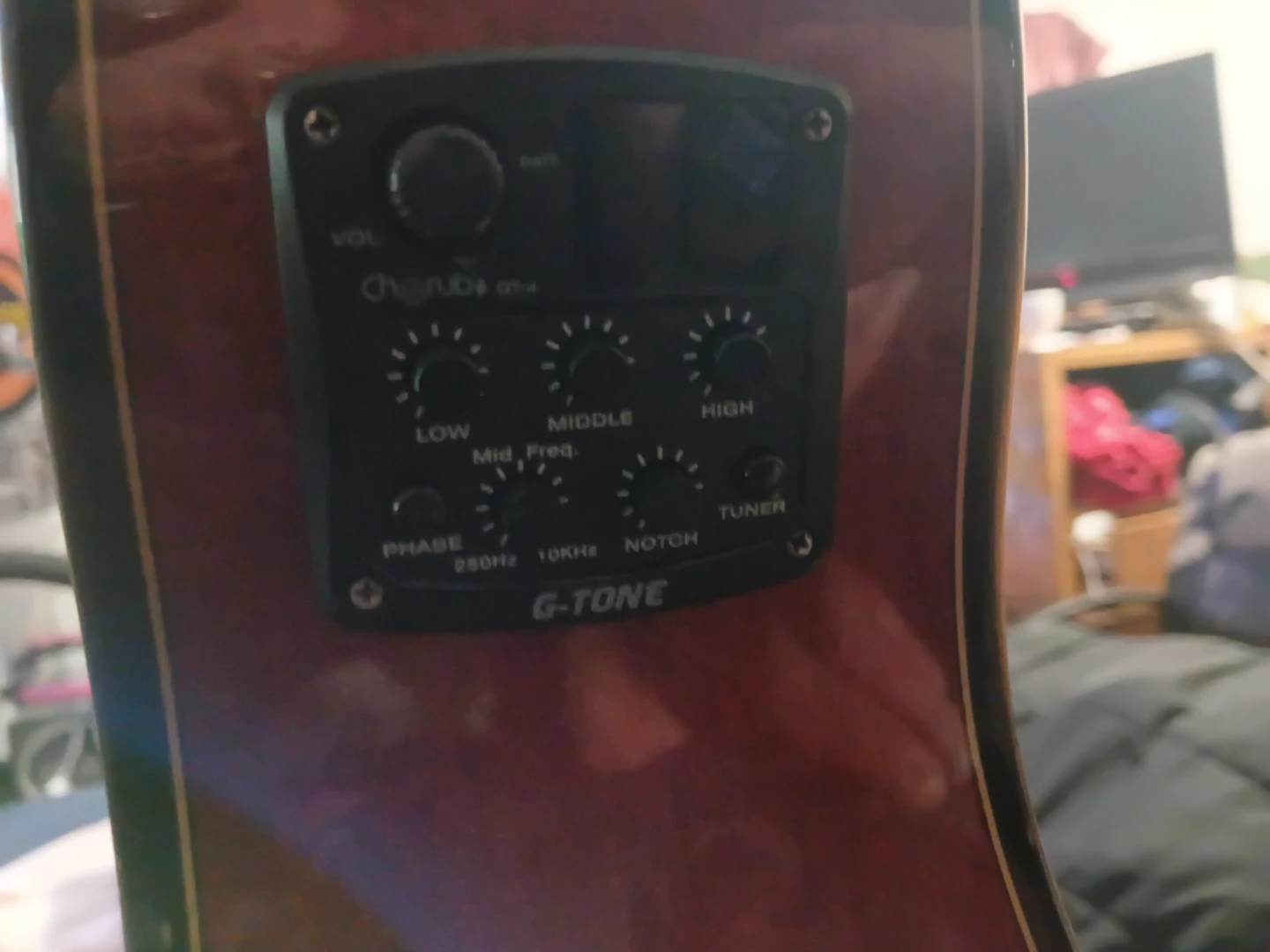 This is a C&D Custom Guitar Celestial acoustic guitar. It has a red finish and is a full-size instrument. This guitar is suitable for aspiring musicians learning to play.