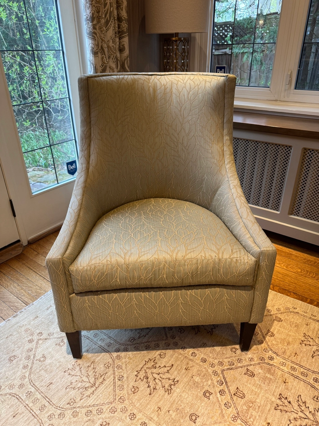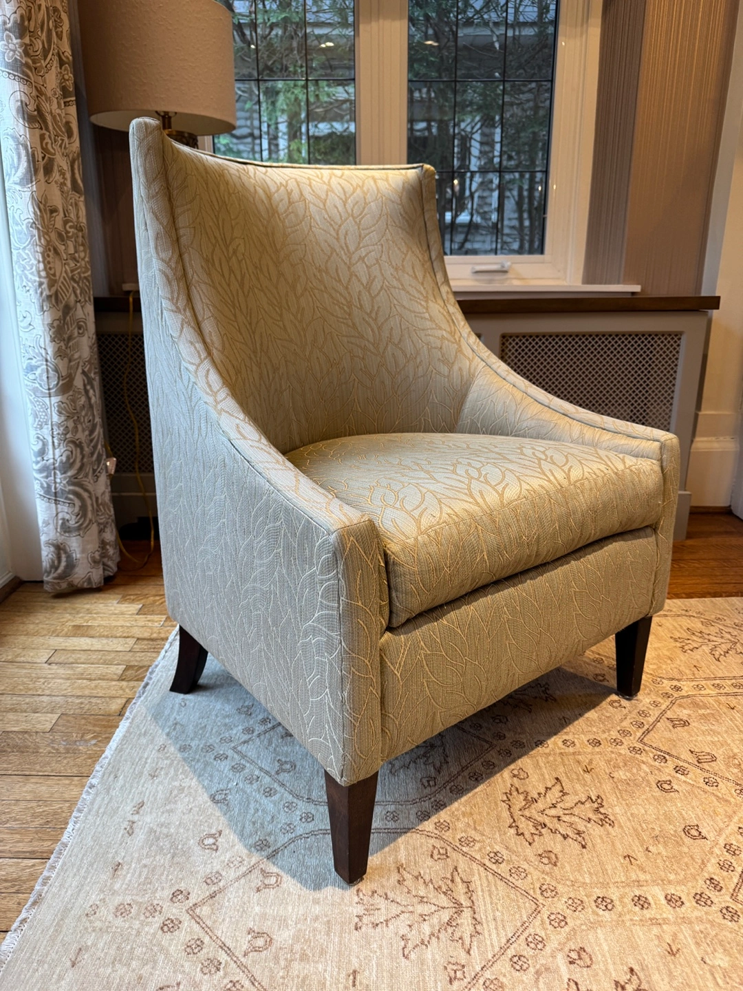 Armchair with curved back and arms. Made by Cornerstone Home Interiors. Neutral light green upholstery with a subtle leaf pattern. Dark brown wooden legs. Used with some imperfections but comfortable.