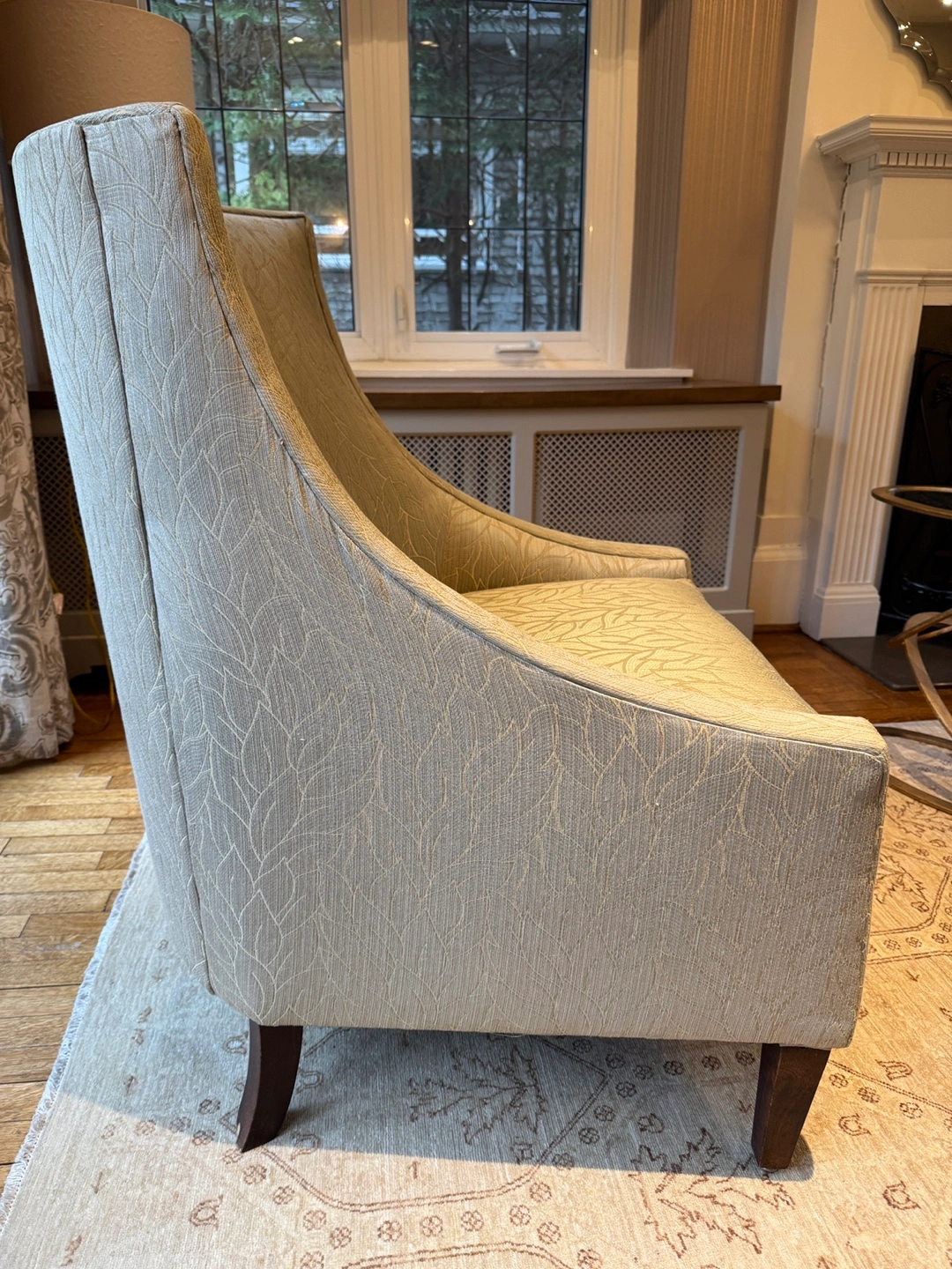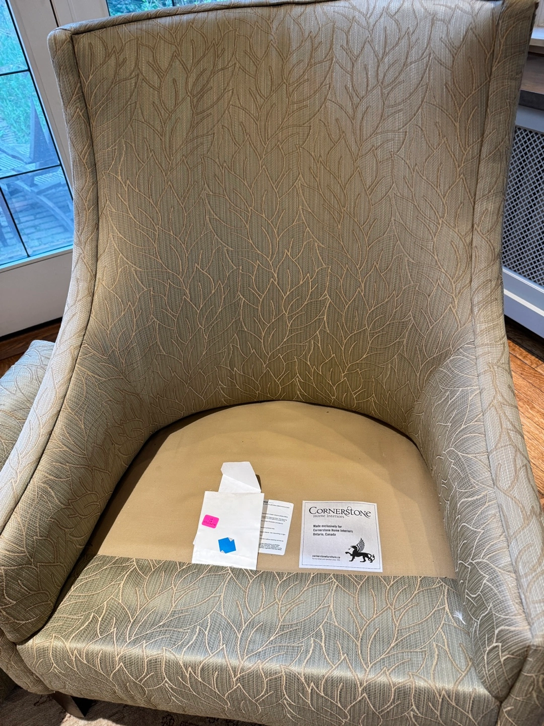 Armchair with curved back and arms. Made by Cornerstone Home Interiors. Neutral light green upholstery with a subtle leaf pattern. Dark brown wooden legs. Used with some imperfections but comfortable.