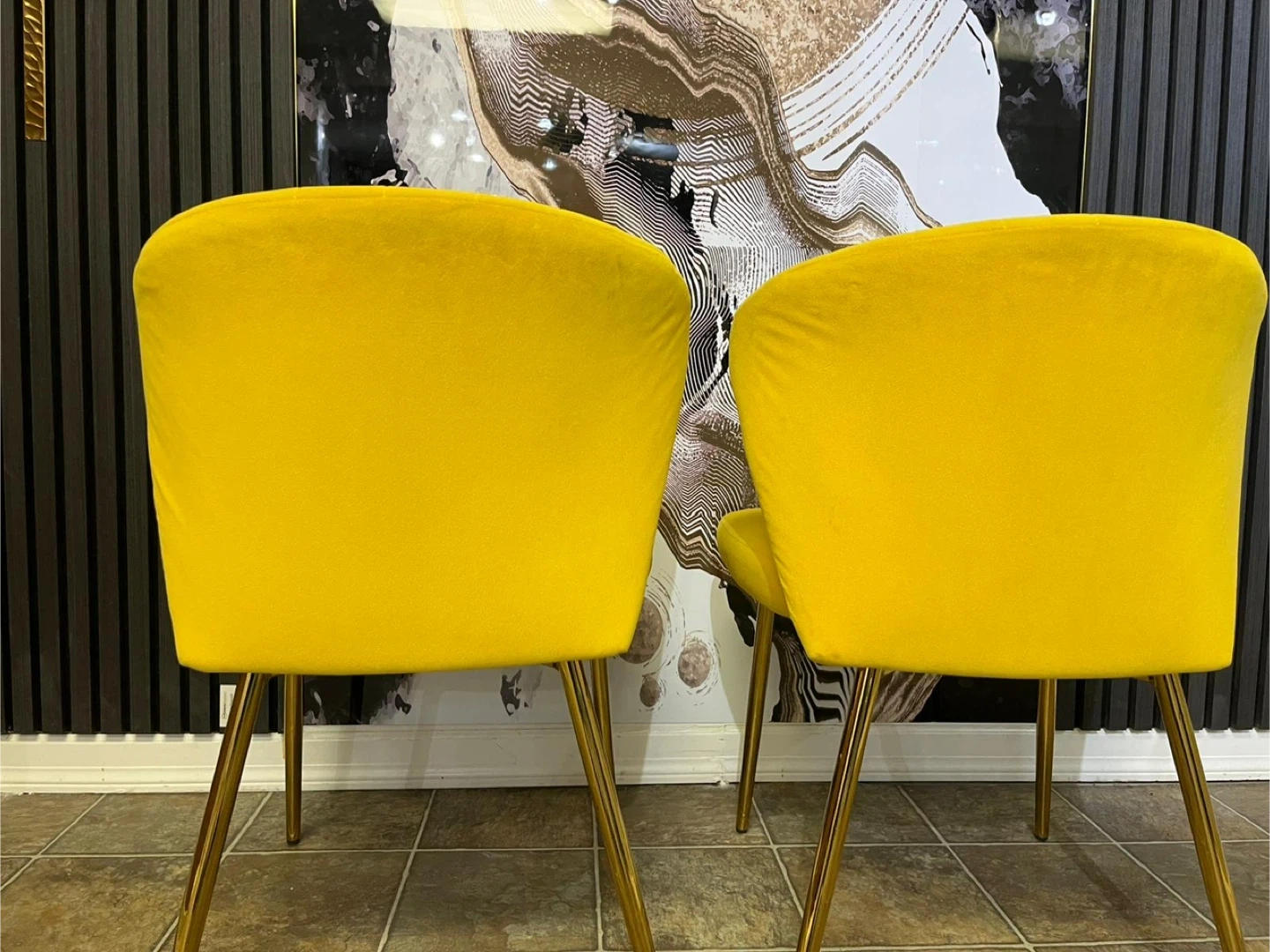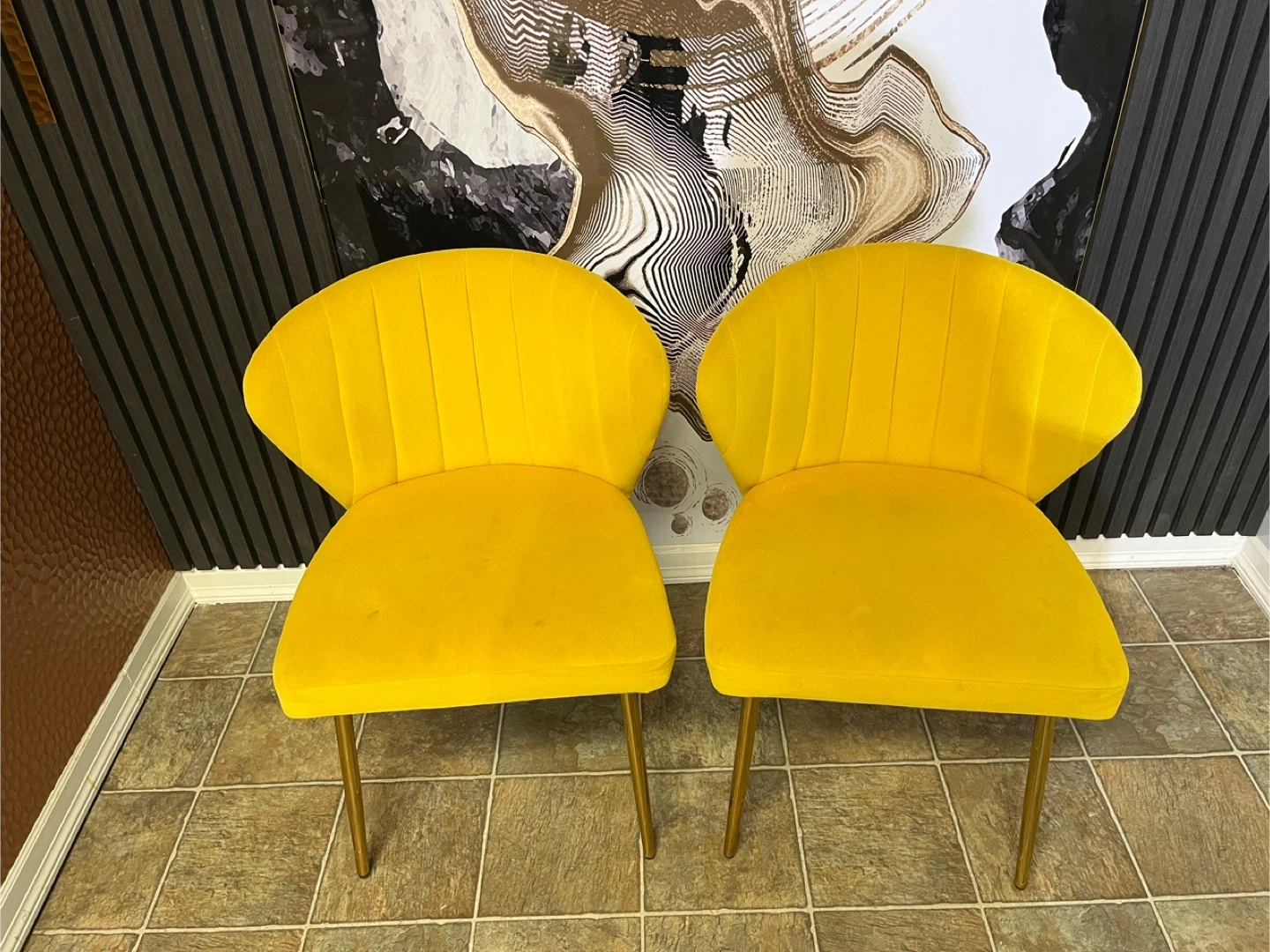 Selling a pair of chic accent chairs upholstered in soft yellow velvet. They have stylish gold metal legs. These chairs would add a pop of colour to any room!
