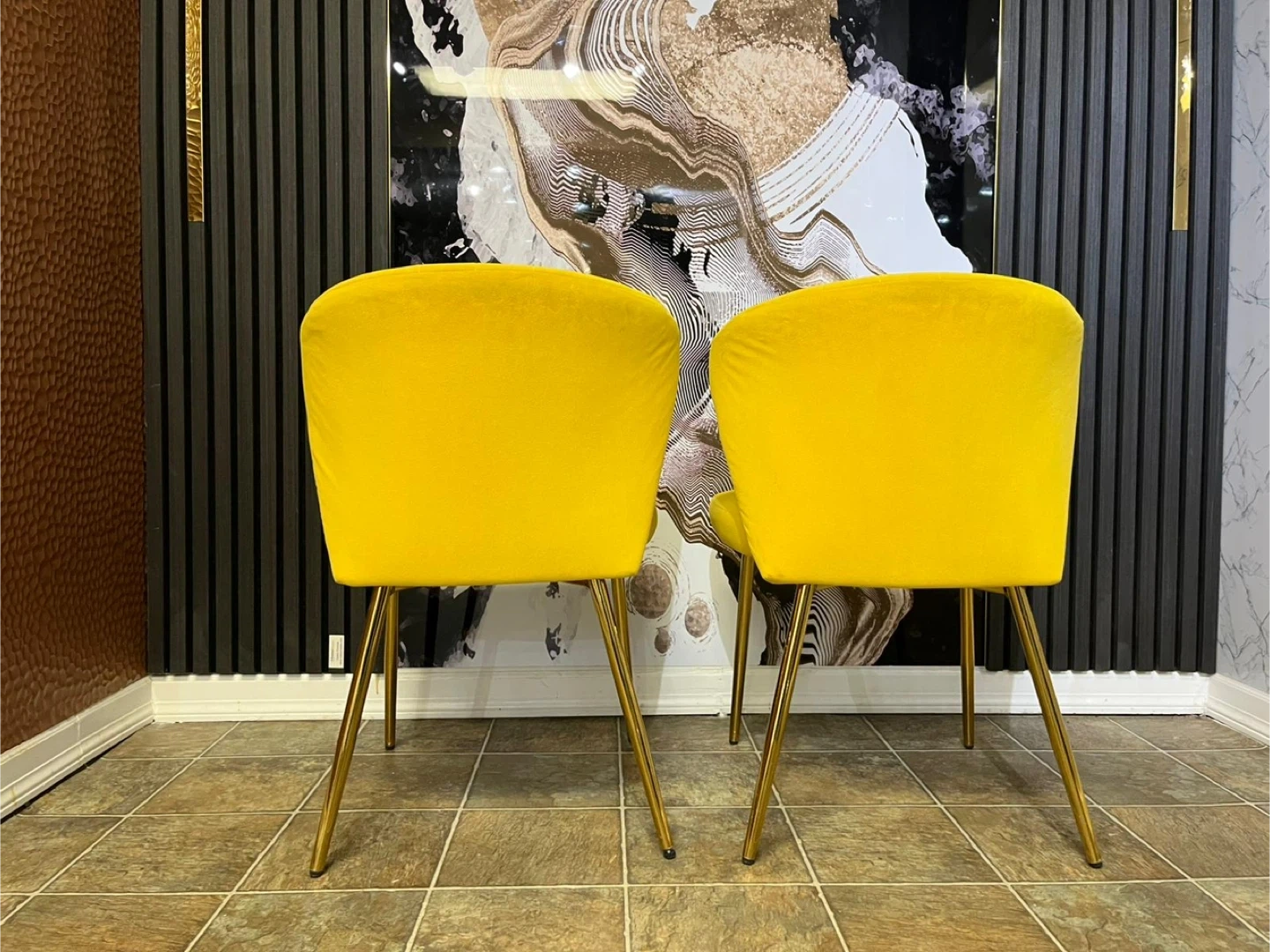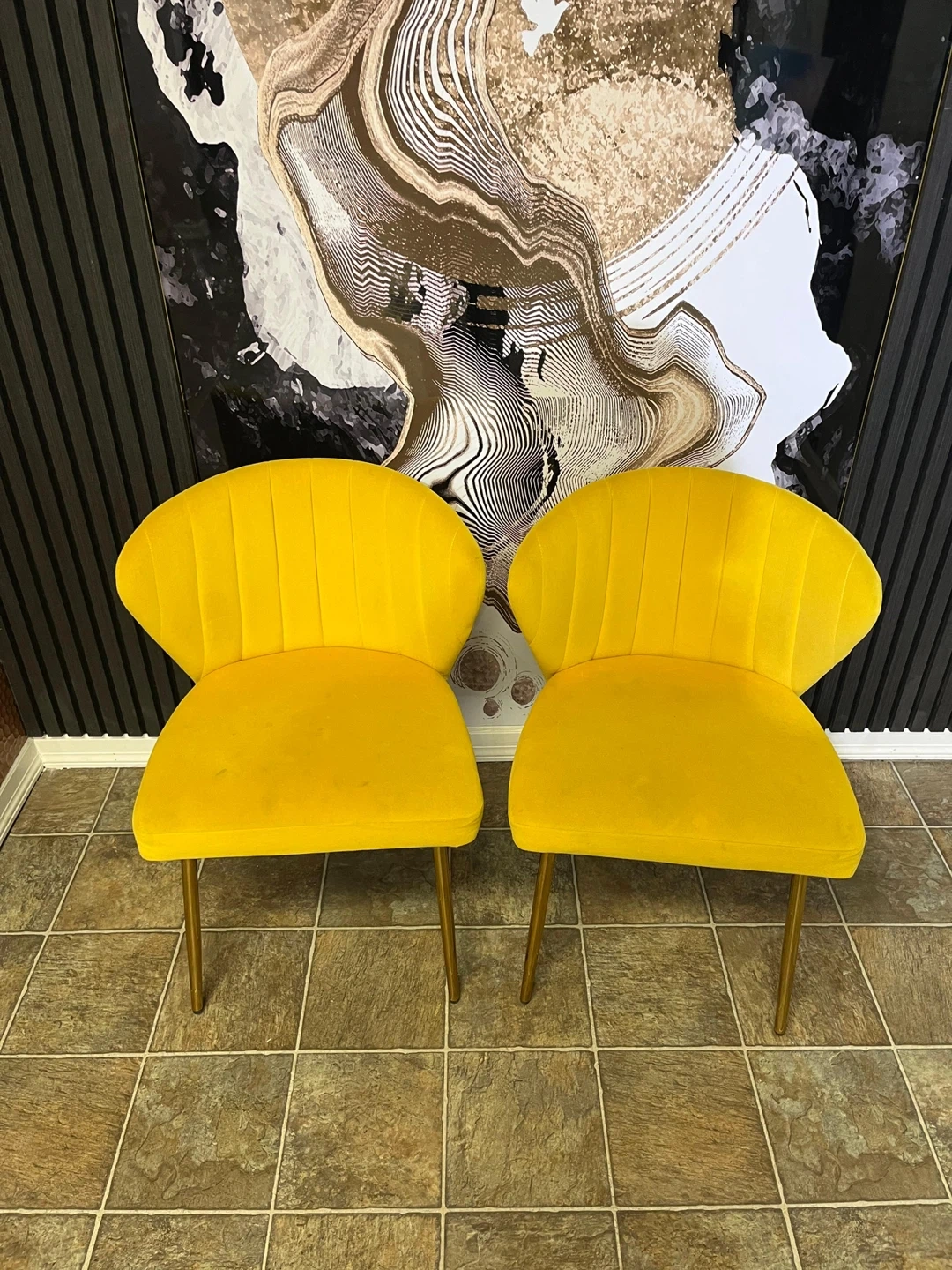 Selling a pair of chic accent chairs upholstered in soft yellow velvet. They have stylish gold metal legs. These chairs would add a pop of colour to any room!