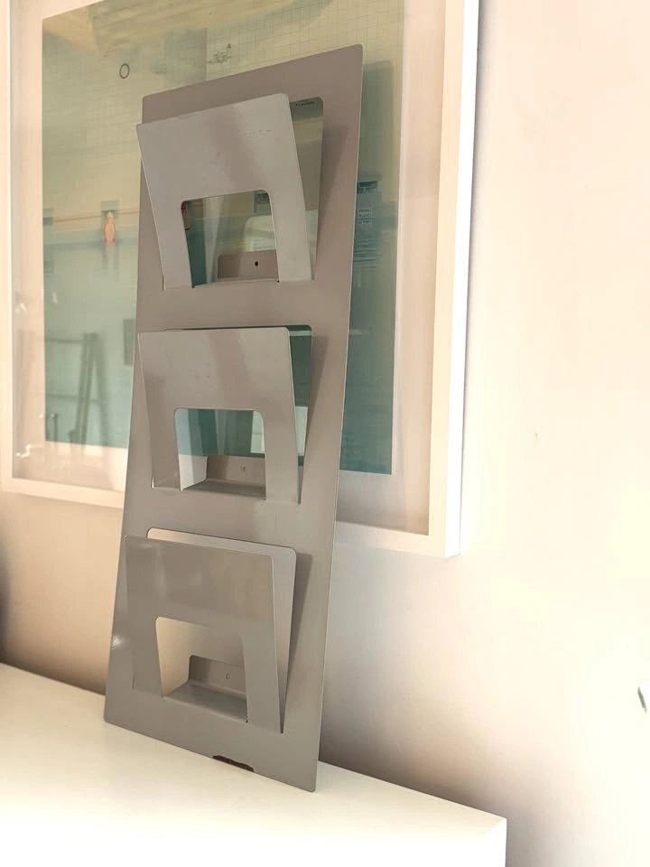 The rack features three pockets, perfect for organizing magazines, mail, or documents. Its sleek grey metal finish will complement a variety of decor styles, from retro and Y2K to modern and Scandinavian.