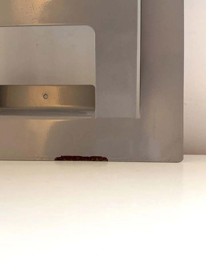 Good condition with wear consistent with age. There is a spot on the bottom right corner where the grey finish has come off exposing the metal underneath. You can paint over it or leave as is. See last picture. Price reflects this.