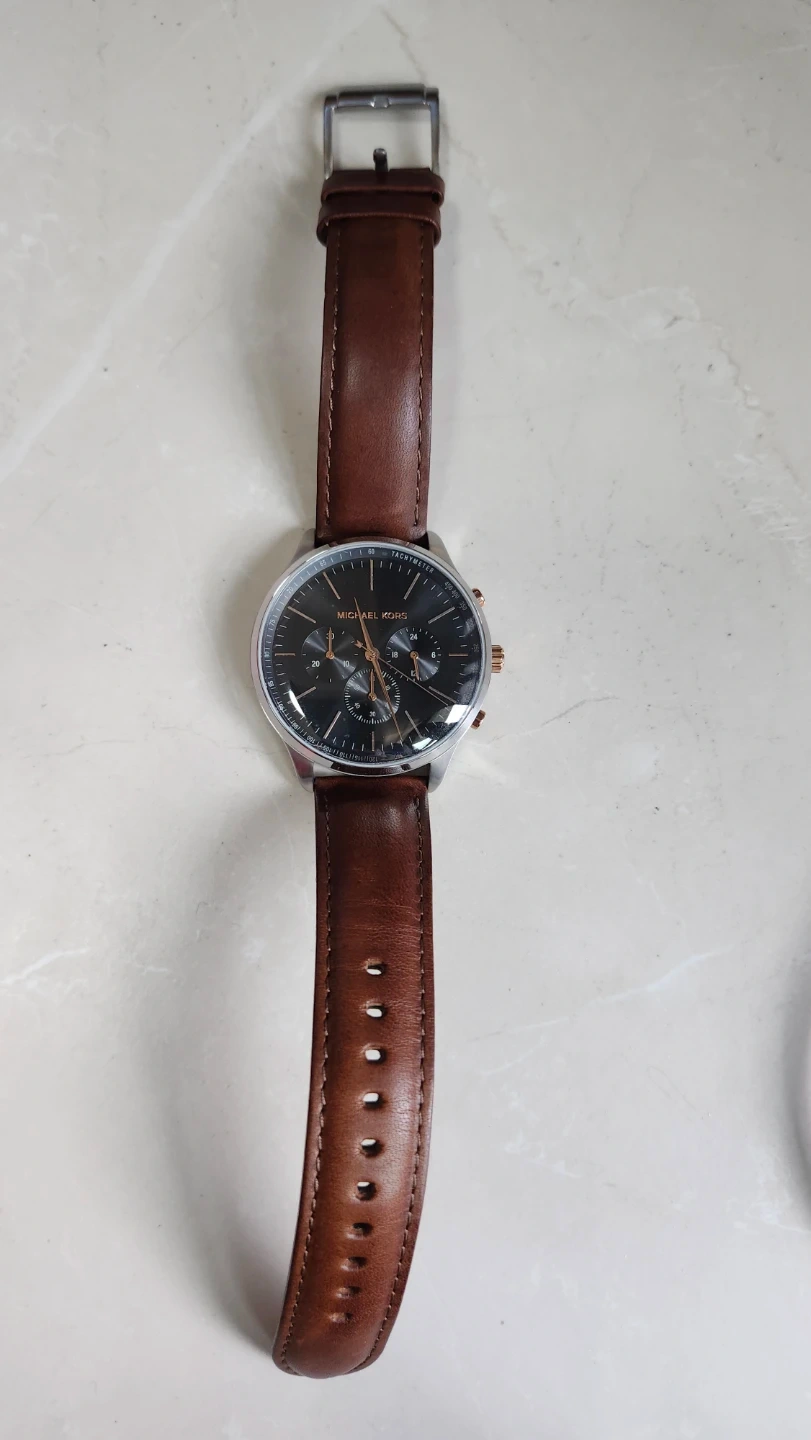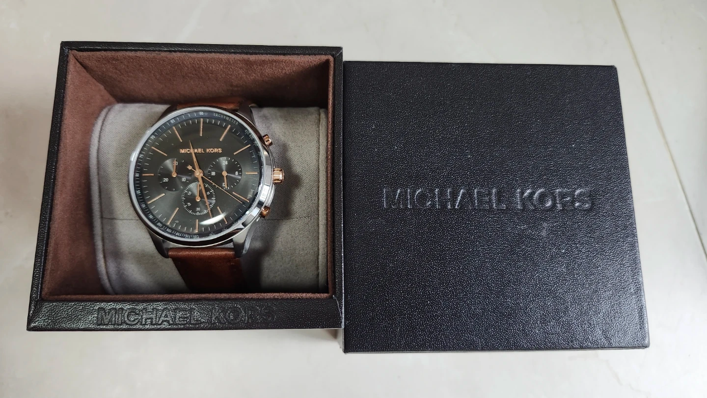 A stylish Michael Kors chronograph watch featuring a black dial and a rich brown leather strap. It includes the original box