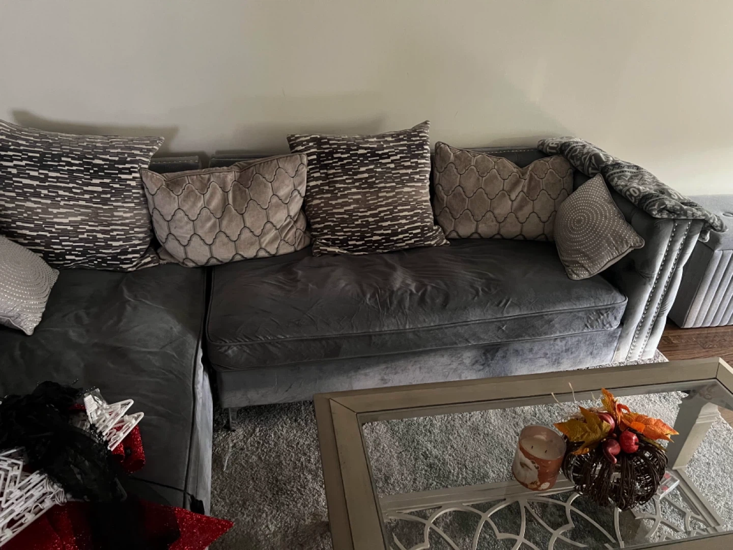 Selling a gray sectional sofa. It's a comfortable piece of furniture that would be great for a living room or den. The sofa features several decorative pillows in various patterns and shades of gray. Smoke free , pet free