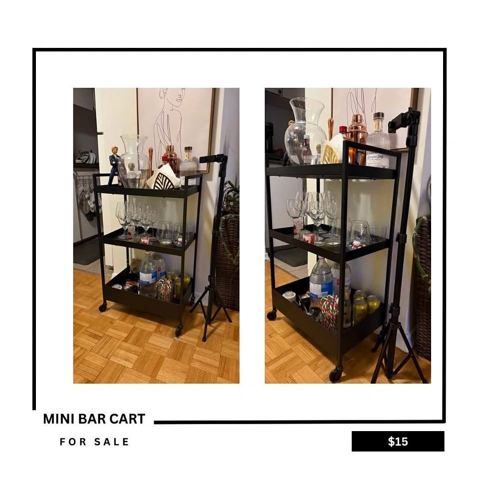 Buy & SellMini Bar CartMini Bar Cart$15Black mini cart bar. Mint condition. Alcohol and glasses not included.WHERE TO MEET111 RAGLAN AVENUEView MapSELLERverifiedJenniffer BLCedarvale1195 reviews1 chats·1 favorites·31 viewsSEND CHAT TO SELLERHi Jenniffer BL! I’m interested in your listing.Hi Jenniffer BL! I’m interested in your listing.Get the Karrot app to chatSign In to chat