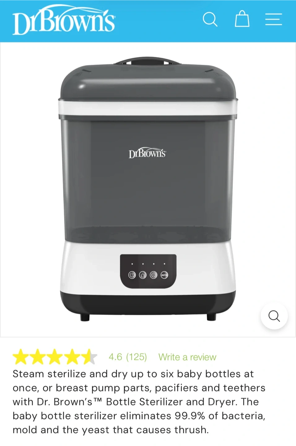 Steam sterilizes and dries up to six baby bottles, pump parts, pacifiers, and teethers. This baby bottle sterilizer eliminates 99.9% of bacteria, mold, and yeast. It's great for keeping baby essentials clean and dry!
