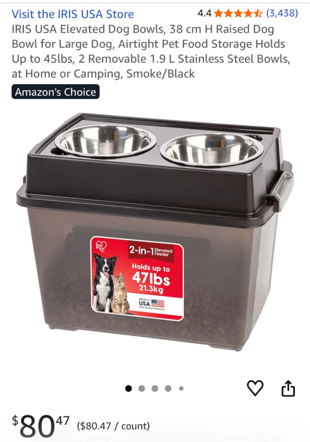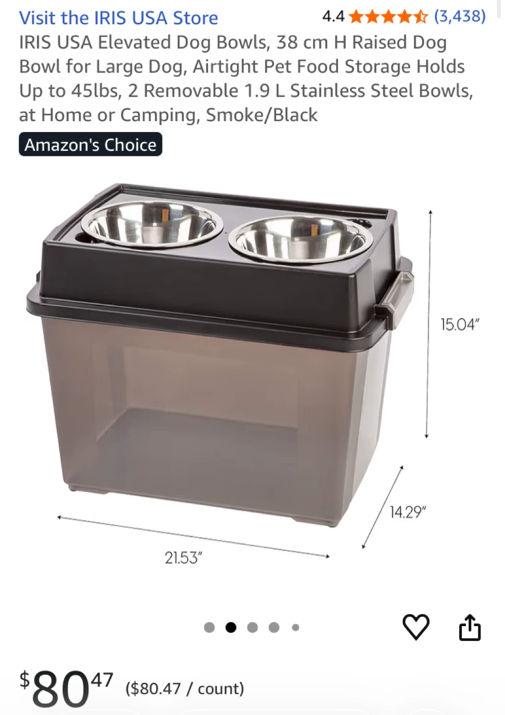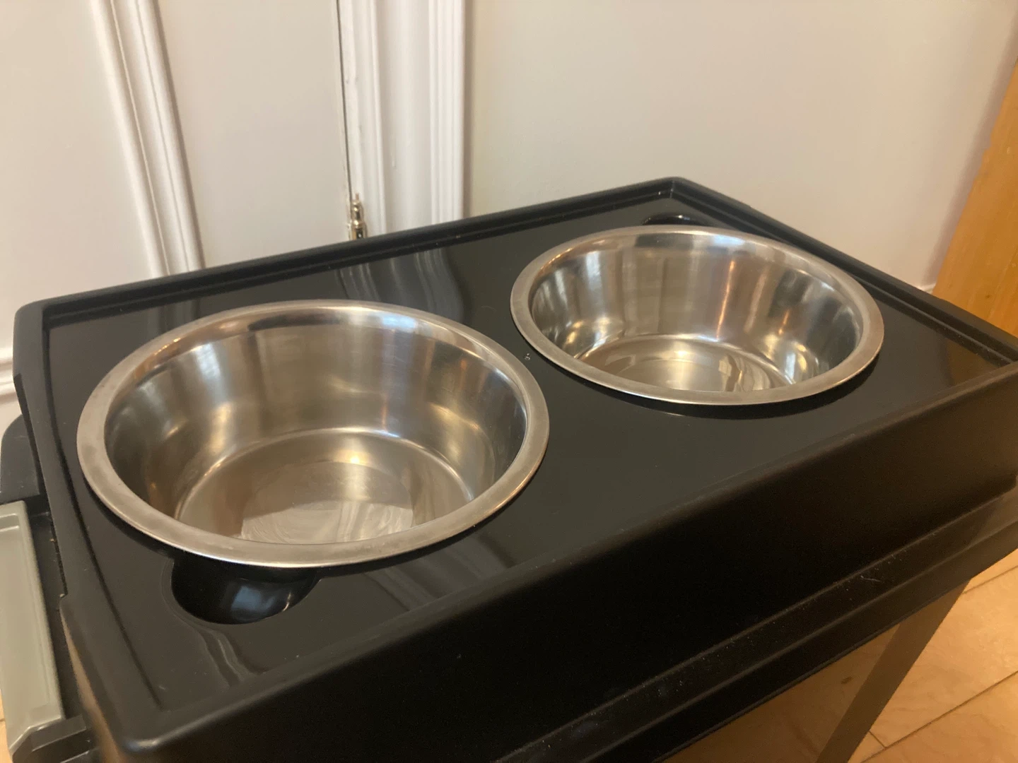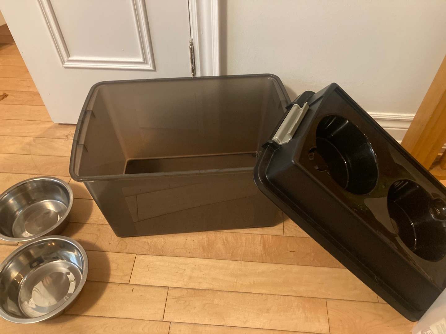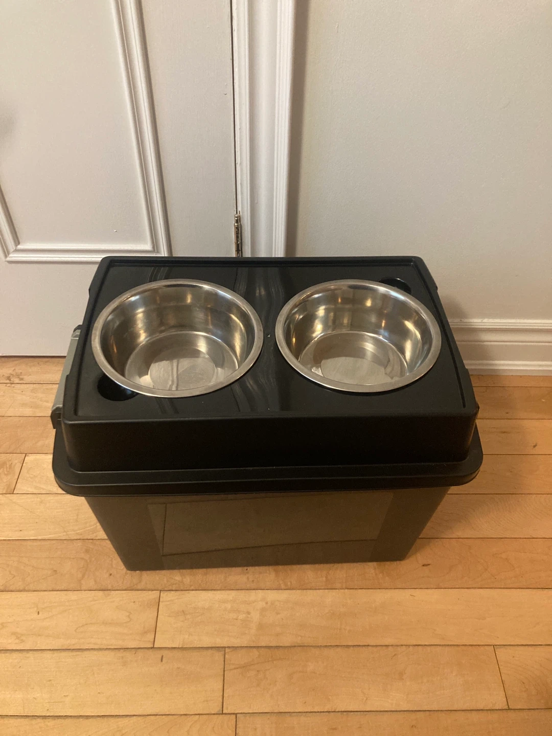 Selling an IRIS USA elevated dog bowl set! It's in great shape and comes with two removable 1.9L stainless steel bowls. The container provides airtight pet food storage, holding up to 45lbs of food. Originally bought for $80.47